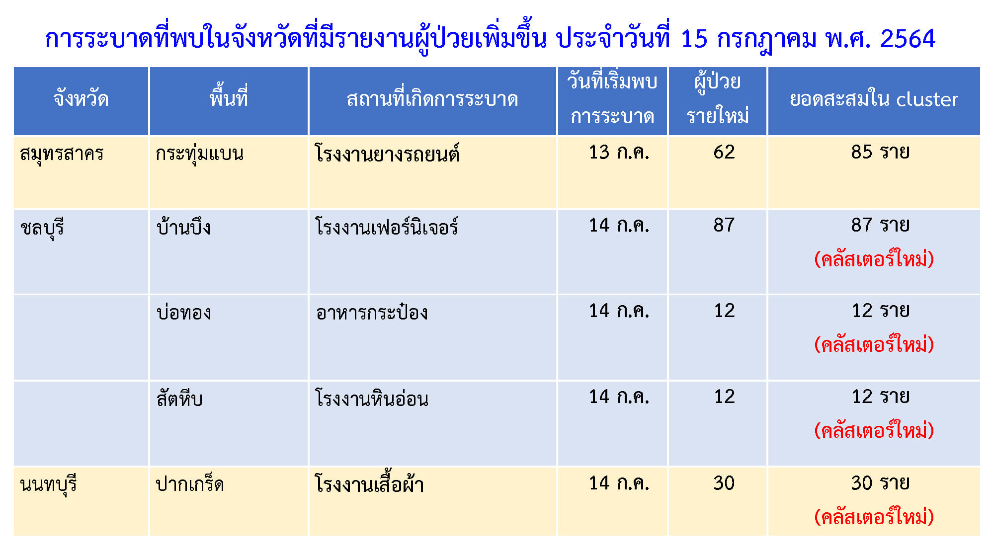 - ชลบุรี อ.บ้านบึง โรงงานเฟอร์นิเจอร์ พบผู้ติดเชื้อ 87 ราย อ.บ่อทอง อาหารกระป๋อง พบผู้ติดเชื้อ 12 ราย อ.สัตหีบ โรงงานหินอ่อน พบผู้ติดเชื้อ 12 ราย