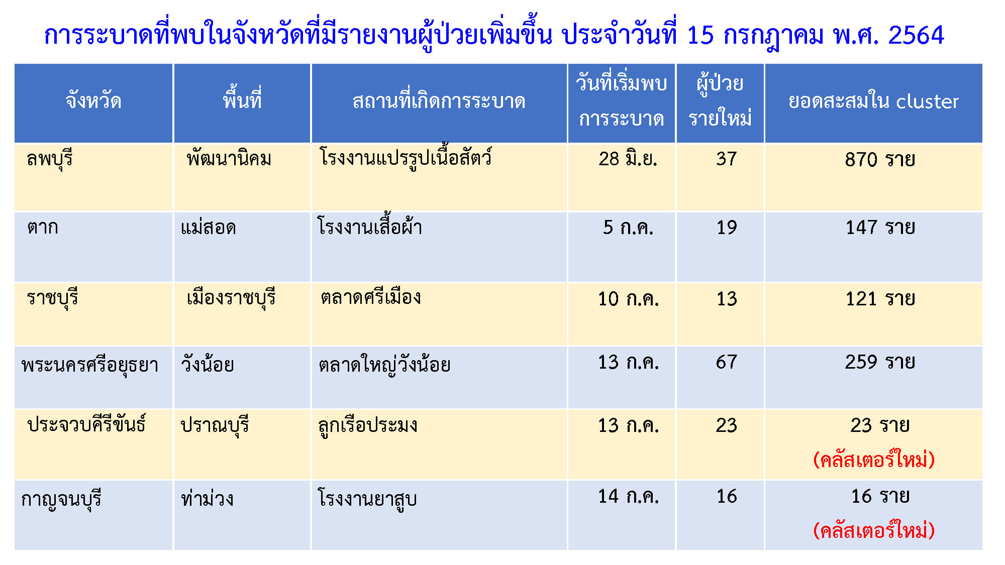 - 7 คลัสเตอร์ใหม่วันนี้ ใน 7 จังหวัด รวมผู้ติดเชื้อ 190 ราย ยังคงพบผู้ติดเชื้อจากกลุ่มก้อนของโรงงาน ซึ่งกลายเป็นคลัสเตอร์ในหลายจังหวัด อีกทั้งก่อนหน้านี้คลัสเตอร์ที่น่าเป็นกังวลคือกลุ่มตลาด ห้างสรรพสินค้า และ โรงเรียน