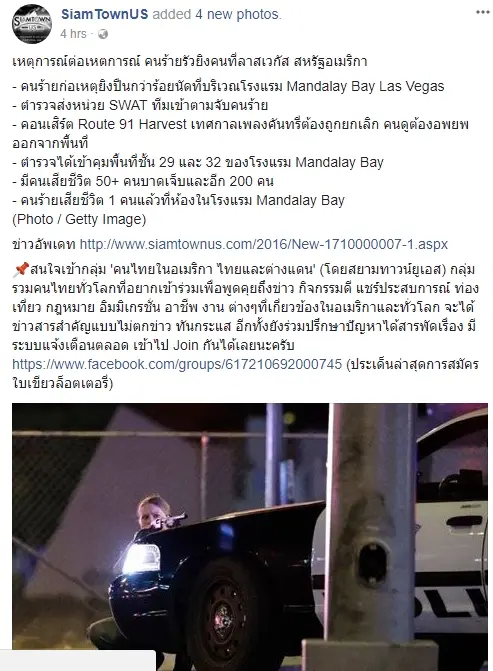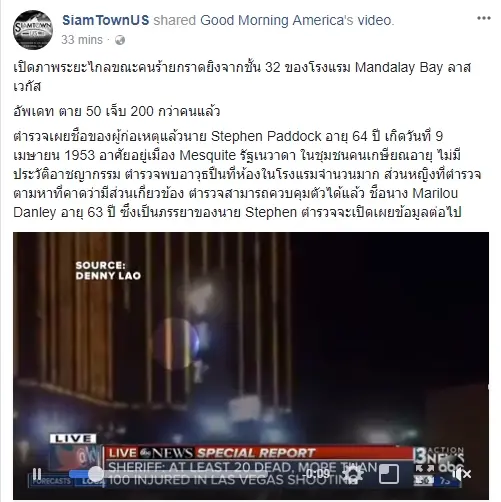 ด้านเฟซบุ๊ก Siamtown US รายงานว่า คนร้ายผู้ก่อเหตุถูกเจ้าหน้าที่ยิงวิสามัญฆาตกรรมแล้วภายในตึกของโรงแรมมัณฑะเลย์ เบย์ ทราบชื่อภายหลัง คือ นายสตีเฟ่น แพดด็อค (Stephen Paddock) อายุ 64 ปี อาศัยอยู่เมือง Mesquite รัฐเนวาดา ในชุมชนคนเกษียณอายุและไม่มีประวัติอาชญากรรม จากการตรวจสอบพบอาวุธปืนที่ห้องในโรงแรมจำนวนมาก ส่วนหญิงที่ตำรวจตามหาที่คาดว่ามีส่วนเกี่ยวข้อง สามารถควบคุมตัวได้แล้วเช่นกัน คือ นางมาริลู แดนลีย์ (Marilou Danley) อายุ 63 ปี ซึ่งเป็นภรรยาของ นายสตีเฟ่น ส่วนสาเหตุของการกราดยิงในครั้งนี้ยังอยู่ในระหว่างการสอบสวนและจะรายงานให้ทราบต่อไป