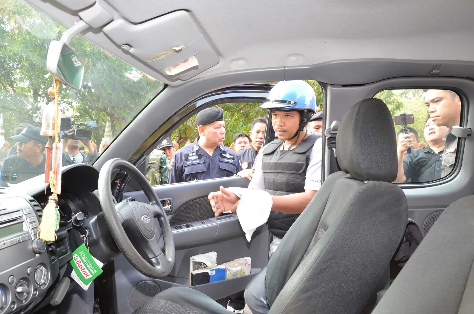 เจ้าหน้าที่ตำรวจต้องใส่หมวกนิรภัยให้ นายทิษณุ โถนารักษ์ หรือ “ชิต สายเบิร์น” เพื่อความปลอดภัย หลังเจ้าหน้าที่ตำรวจภูธรจังหวัดกาฬสินธุ์และทหารนำตัวมาทำแผนประกอบคำรับสารเพิ่มเติมบริเวณสามแยกทางเข้ามหาวิทยาลัยซึ่งเป็นจุดเกิดเหตุ ซึ่งมีชาวบ้านและนักศึกษาที่มุงดูเหตุการณ์รุมตะโกนสาปแช่งในการก่อเหตุดังกล่าว ซึ่งการทำแผนดังกล่าวต่อเนื่องจากเมื่อวานนี้ที่คุมตัวไปชี้จุดและทำแผนเบื้องต้นตามเส้นทางถนนตั้งแต่ อ.สมเด็จ จนถึง จ.สกลนคร ที่คนร้ายฉุดนักศึกษาขึ้นรถแล้วขับไปตามถนนระยะทางกว่า 80 กิโลเมตร