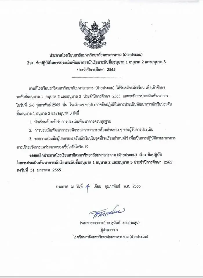 ขอยกเลิกประกาศโรงเรียนสาธิตมหาวิทยาลัยมหาสารคาม (ฝ่ายประถม) เรื่อง ข้อปฏิบัติในการประเมินพัฒนาการนักเรียนระดับชั้นอนุบาล 1 อนุบาล 2 และอนุบาล 3 ประจำปีการศึกษา 2565 ลงวันที่ 31 ม.ค. 2565