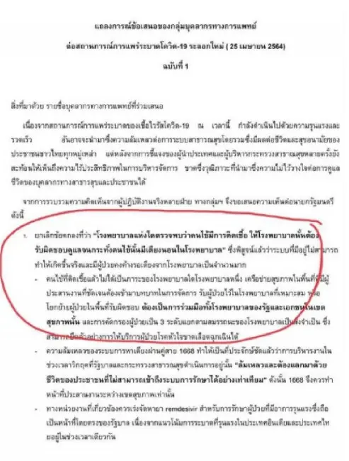 จากการรวบรวมความคิดเห็นจากผู้ปฏิบัติงานจริงหลายฝ่าย ทางกลุ่มฯ จึงขอเสนอความเห็นต่อนายกรัฐมนตรียกเลิกข้อตกลงที่ว่า โรงพยาบาลแห่งใดตรวจพบว่าคนไข้มีการติดเชื้อให้โรงพยาบาลนั้นต้องรับผิดชอบดูแล จนกระทั่งคนไข้นั้นมีเตียงนอนในโรงพยาบาล ซึ่งพิสูจน์แล้วว่าระบบที่มีอยู่ไม่สามารถทำให้เกิดขึ้นจริง และมีผู้ป่วยคงค้างรอเตียงจากโรงพยาบาลเป็นจำนวนมาก