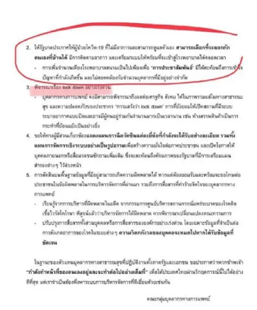 บุคลากรทางการแพทย์ ขอให้ล็อกดาวน์ เนื่องจากสถานการณ์การแพร่กระจายของ CV-19 ณ เวลานี้ กำลังดำเนินไปด้วยความรุนแรงและอันอาจจะนำมาซึ่งความล้มเหลวต่อการระบบสาธารณสุขโดยรวม ซึ่งมีผลต่อชีวิตและสุขอนามัยของประชาชนชาวไทยทุกหมู่เหล่า แต่หลังจากการชี้แจงของผู้นำประเทศและผู้บริหารกระทรวงสาธารณสุขหลายครั้ง ยังสะท้อนให้เห็นถึงความไร้ประสิทธิภาพในการบริหารจัดการ ขาดซึ่งวุฒิภาวะที่นำมาซึ่งความไม่ไว้วางใจต่อการดูแลชีวิตของบุคลากรทางสาธารณสุขและประชาชนได้