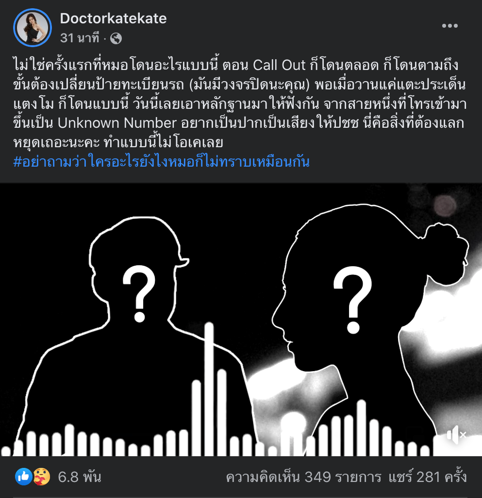 แต่หลังจากที่ หมอของขวัญ ได้โพสข้อความแรกไป ก็มีโพสที่ 2 ตามมาติดๆ แต่รอบนี้มาเป็นคลิปเสียงพร้อมแคปชั่นว่า ไม่ใช่ครั้งแรกที่หมอโดนอะไรแบบนี้ ตอน Call Out ก็โดนตลอด ก็โดนตามถึงขั้นต้องเปลี่ยนป้ายทะเบียนรถ (มันมีวงจรปิดนะคุณ) พอเมื่อวานแค่แตะประเด็นแตงโม ก็โดนแบบนี้ วันนี้เลยเอาหลักฐานมาให้ฟังกัน จากสายหนึ่งที่โทรเข้ามาขึ้นเป็น Unknown Number อยากเป็นปากเป็นเสียงให้ปชช นี่คือสิ่งที่ต้องแลก หยุดเถอะนะคะ ทำแบบนี้ไม่โอเคเลย #อย่าถามว่าใครอะไรยังไงหมอก็ไม่ทราบเหมือนกัน