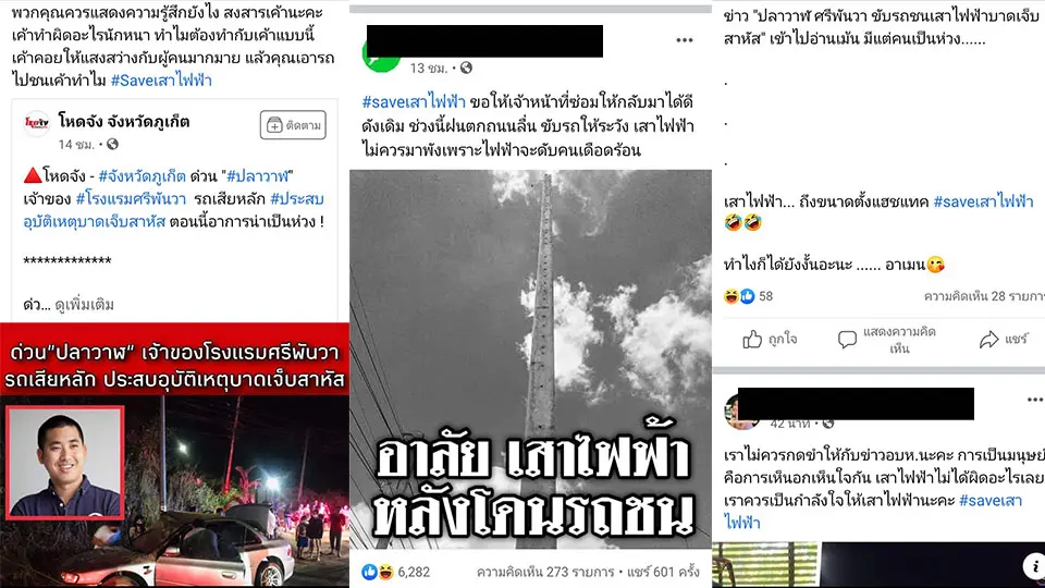 #Saveเสาไฟฟ้า จากกรณีที่ ไฮโซ ปลาวาฬ เจ้าของโรงแรมศรีพันวา รถเสียหลัก ประสบอุบัติเหตุ ขับรถชนเสาไฟ บริเวณริมถนน หน้าโรงเรียนบ้านอ่าวน้ำบ่อ ต. เมือง จ. ภูเก็ต โดยคนขับถูกอัดติดภายในรถ เจ้าหน้าที่มูลนิธิกุศลธรรมต้องใช้เครื่องตัดถ่าง นำร่างออกมาจากรถโดยใช้เวลาประมาณ 1 ชั่วโมงจากการตรวจสอบพบว่าคนขับรถคันดังกล่าว คือ นายวรสิทธิ อิสสระ กรรมการผู้จัดการ โรงแรมศรีพันวา ภูเก็ต หรือ “ปลาวาฬ” เจ้าของโรงแรมศรีพันวา