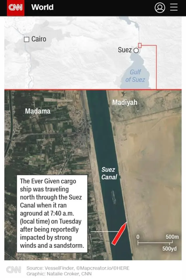ทำให้มีเรือเกือบ 1.9 หมื่นลำต่อปีใช้คลองนี้ คิดเป็น 30% ของสินค้าทางเรือในโลกและคิดเป็น 12% ของการขนส่งสินค้าทั้งหมดโดยเฉพาะเรือจากเอเชีย/ยุโรป เกือบทั้งหมดใช้คลองนี้คลองสุเอซจึงสำคัญมหาศาล แต่เมื่อเรือยักษ์วิ่งผ่าน เจอพายุทรายในวันที่ 23 เรือเบี่ยงไปชนริมคลอง ก่อนขวางคลองในที่สุดพายุทรายดังกล่าวเร็ว 74 กม./ชม. แต่แรงแค่นั้นไม่น่าจะเบี่ยงเรือได้ ปัญหาคือพายุทรายทำให้ทัศนวิสัยต่ำมาก ประกอบกับโน่นนี่ ทำให้เรือขวางคลองขวางแล้วทำไง ? นั่นคือปัญหาครับ เพราะขวางแบบสนิท เรือวิ่งไปมาไม่ได้เลย คลองช่วงนี้กว้างแค่ 250 เมตร เรือยาว 400 เมตร ตัวเลขแค่นี้คงพอเข้าใจว่าไปไม่ได้แน่เนื่องจากเรือยักษ์มาก และเป็นเหตุการณ์ไม่เคยเกิดมาก่อน ทำให้การแก้ปัญหาเป็นไปได้ยากเรืออื่นๆ จึงติดกันสนั่นโลก ถึงตอนเย็นนี้ ติดไปแล้ว 170 ลำ และสะสมมากขึ้นเรื่อยๆ