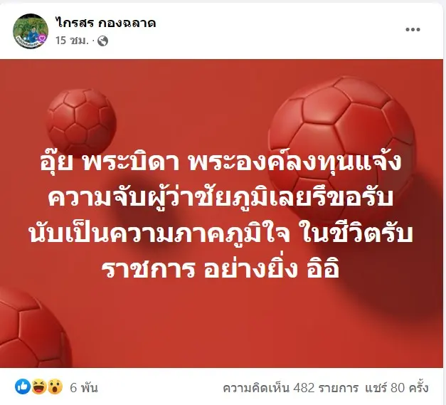 นายไกรสร กองฉลาด ผู้ว่าฯชัยภูมิ โพสต์ข้อความในเฟซบุ๊ก ไกรสร กองฉลาด ระบุข้อความว่า “อุ๊ย พระบิดา พระองค์ลงทุนแจ้งความจับผู้ว่าชัยภูมิเลยรึขอรับ นับเป็นความภาคภูมิใจ ในชีวิตรับราชการ อย่างยิ่ง อิอิ”
