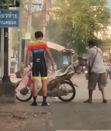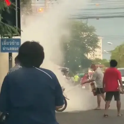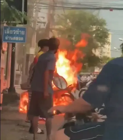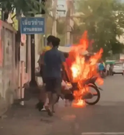 โดยเหตุการณ์เกิดขึ้นเมื่อ ชายคนขี่มอเตอร์ไซค์ แล้วรู้สึกถึงความผิดปกติของรถ เนื่องจากความร้อนที่สูงขึ้นจากใต้เบาะจนรู้สึกได้ จึงได้จอดรถและเข็นเข้าข้างทาง ทันใดนั้นก็สังเกตว่าควันขึ้นจากใต้เบาะนั่ง พอเปิดดูไฟก็ลุกพรึบทันที ชาวบ้านที่เห็นเหตุการณ์ต่างวิ่งเอาน้ำมาช่วยดับไฟ แต่กลับกลายว่าไฟไม่ยอมดับและลุกไหม้แรงกว่าเดิม สุดท้ายได้มีลุงพลเมืองดีนำถังดับเพลิงเข้ามาฉีด จึงสามารถระงับเหตุได้