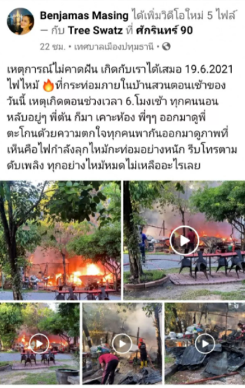 “เหตุการณ์ไม่คาดฝัน เกิดกับเราได้เสมอ 19.6.2021 ไฟไหม้ ที่กระท่อมภายในบ้านสวนตอนเช้าของวันนี้ เหตุเกิดตอนช่วงเวลา 6โมงเช้า ทุกคนนอนหลับอยู่ๆ พี่ต้น ก็มา เคาะห้อง พี่ๆๆ ออกมาดูพี่ ตะโกนด้วยความตกใจทุกคนพากันออกมาดูภาพที่เห็นคือไฟกำลังลุกไหม้กะท่อมอย่างหนัก รีบโทรตามดับเพลิง ทุกอย่างไหม้หมดไม่เหลืออะไรเลย”