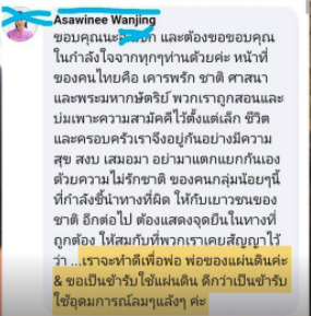 ขอขอบคุณในกำลังใจจากทุกๆท่านด้วยค่ะหน้าที่ของคนไทยคือ เคารพรัก ชาติ ศาสนา และ พระมหากษัตริย์ พวกเราถูกสอนและบ่มเพาะความสามัคคีไว้ตั้งแต่เล็กชีวิตและครอบครัวเราจึงอยู่กันอย่างมีความสุขสงบเสมอมา อย่ามาแตกแยกกันเองด้วยความไม่รักชาติของคนกลุ่มน้อยนี้ที่กำลังชี้นำทางที่ผิดให้กับเยาวชนของชาติอีกต่อไปต้องแสดงจุดยืนในทางที่ถูกต้อง ให้สมกับที่พวกเราเคยสัญญาไว้ว่า “เราจะทำดีเพื่อพ่อ พ่อของแผ่นดินค่ะ & ขอเป็นข้ารับใช้แผ่นดิน ดีกว่าเป็นข้ารับใช้อุดมการณ์ลม ๆ แล้ง ๆ ค่ะ”