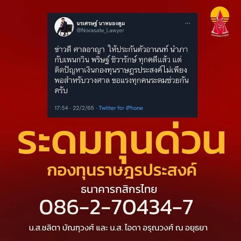 22 ก.พ. 64 ทวิตเตอร์ นรเศรษฐ์ นาหนองตูม@Norasate_Lawyer ของนายนรเศรษฐ์ นาหนองตูม ทนายความศูนย์ทนายความเพื่อสิทธิมนุษยชน ได้โพสต์ข้อความระบุว่า ข่าวดี ศาลอาญา ให้ประกันตัวอานนท์ นำภากับเพนกวิน พริษฐ์ ชิวารักษ์ ทุกคดีแล้ว แต่ติดปัญหาเงินกองทุนราษฎรประสงค์ไม่เพียงพอสำหรับวางศาล ขอแรงทุกคนระดมช่วยกันครับ