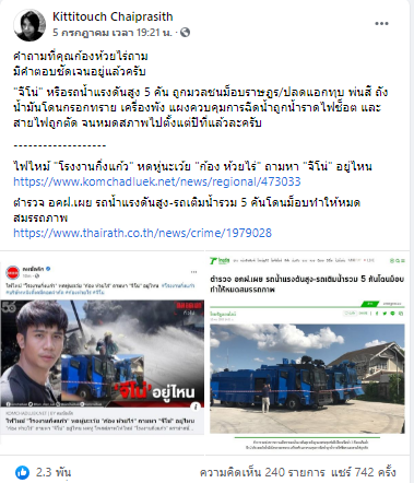 จากกรณีดังกล่าวทำให้นักร้องชื่อดัง ก้อง ห้วยไร่ หรือ นายอัครเดช ยอดจำปา ก็ได้ออกมาโพสต์ภาพผ่านเฟซบุ๊กพร้อมระบุข้อความว่า “หดหู่นะเว๊ย คุณค่าชีวิตพวกเรา มันไม่มีในสายตาเลยหรอ รถฉีดน้ำที่มันแรงๆ อะ ฉีดทีคนกระเด็นอะ อยู่ไหน”