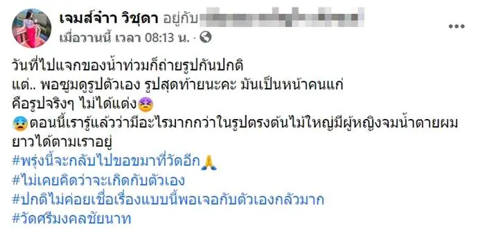 สาวโพสต์เล่าประสบการณ์ขนหัวลุก ขณะไปช่วยแจกของให้แก่ผู้ประสบภัยน้ำท่วม โดยผู้ใช้บัญชี ได้เล่าถึงเหตุการณ์ดังกล่าวว่าตนและเพื่อนๆ ได้รวมตัวกันซื้อของไปบริจาคช่วยผู้ประสบภัยน้ำท่วมที่ วัดศรีมงคลชัยนาท แล้วปรากฏว่าเมื่อเธอกลับมาดูรูปถ่ายขณะไปทำกิจกรรมกลับพบว่า ใบหน้าของตนเป็นคนแก่