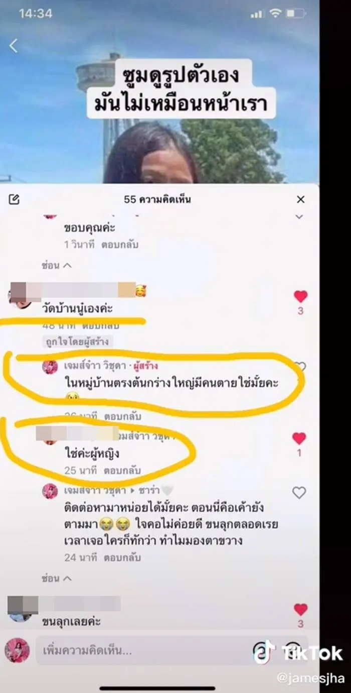 ซึ่งเธอเองก็รู้สึกแย่มากที่มาช่วยคนแต่กลับเจอเรื่องแบบนี้ มาทำดีแท้ๆแต่กลับโดนผีติดตาม โดยหลังจากเหตุการณ์ดังกล่าว ก็ได้กลับไปยังจุดเกิดเหตุและขอขมาหากล่วงเกิน หรือทำอะไรที่เป็นเหตุให้วิญญาณหรือสิ่งลี้ลับติดตามตัว โดยเธอได้ระบุรายละเอียดผ่านบัญชี TikTok @jamesjha ไว้ดังภาพ