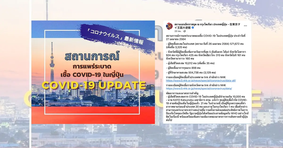 ล่าสุดสถาการณ์การแพร่ระบาดโควิด-19 ในประเทศญี่ปุ่น มีผู้ติดเชื้อสะสมในประเทศ 571,672 คน ผู้เสียชีวิตสะสม 10,012 คน ผู้ติดเชื้ออาการรุนแรง 898 คน และ ผู้ที่รักษาหายสะสม 504,738 คน ( อัปเดทเมื่อวันที่ 27 เมษายน )