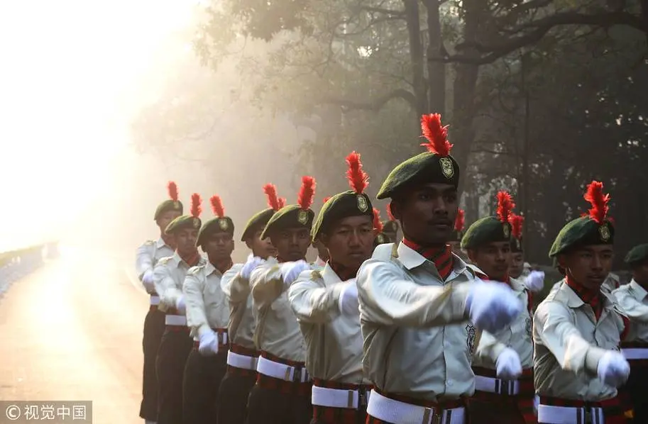 ซินหัว เผยภาพการฝึกซ้อมเดินสวนสนาม ของกองทัพ ทหารอินเดีย ท่ามกลางหมอกหนา ในเมืองกัลกัตต้า (Kolkata) เมืองหลวงของรัฐเบงกอลตะวันตก