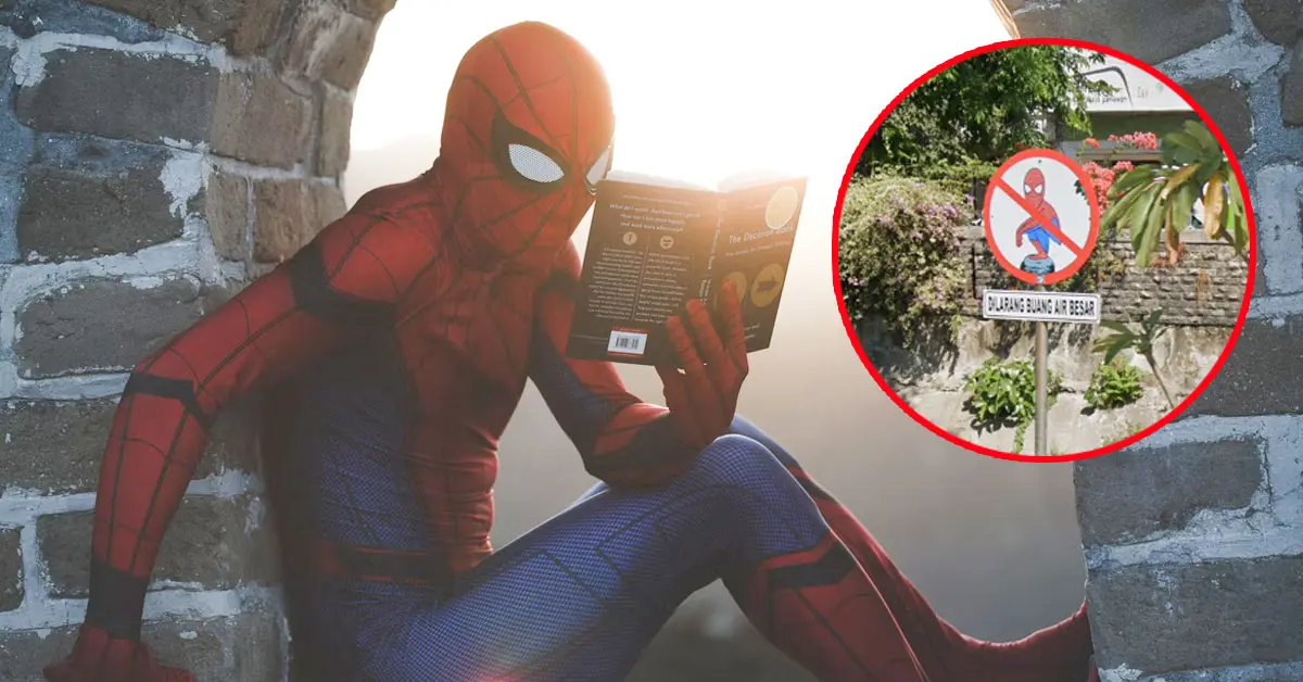 ผู้ใช้ Reddit คนหนึ่งเห็นป้ายตลกๆ ป้ายหนึ่ง ในเมืองสุราบายา ประเทศอินโดนีเซีย ข้าง Jl ถ.นิมปุงกัน. จาก Google Maps โดยในป้ายดังกล่าวเป็นภาพชายใส่ชุดสีน้ำเงินแดง คล้ายตัวละครฮีโร่อย่าง Spider-Man กำลังทำน่านั่งยองๆอยู่บนโขดหิน โดยใต้ป้ายดังกล่าวมีคำเขียนกำกับไว้ว่า “dilrang buang air besar” แปลว่า ห้ามถ่ายอุจจาระ