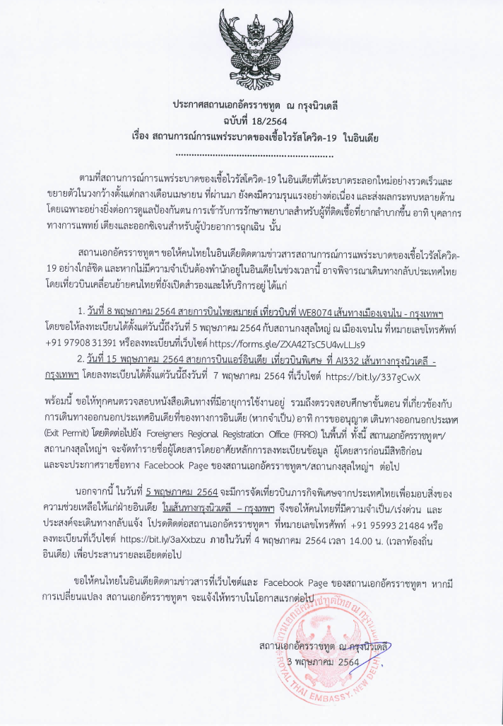 รับคนไทยจากอินเดีย —– เฟสบุ๊กของสถานเอกอัครราชทูต ณ กรุงนิวเดลีได้ออกประกาศสถานเอกอัครราชทูตฯ ฉบับที่ 18/2564 เกี่ยวกับสถานการณ์แพร่ระบาดของโควิด19ระลอกใหม่ในอินเดีย ที่พบการแพร่ระบาดอย่างรวดเร็วและขยายตัวในวงกว้าง ตั้งแต่เดือนเมษายนที่ผ่านมา ยังคงมีความรุนแรงต่อเนื่อง และส่งผลกระทบหลายด้าน โดยเฉพาะอย่างยิ่งต่อการดูแลป้องกันตน การเข้ารับการรักษาพยาบาลสำหรับผู้ติดเชื้อที่ยากลำบากขึ้น อาทิ บุคคลากรทางการแพทย์ เตียงและออกซิเจนสำหรับผู้ป่วยอาการฉุกเฉินนั้น
