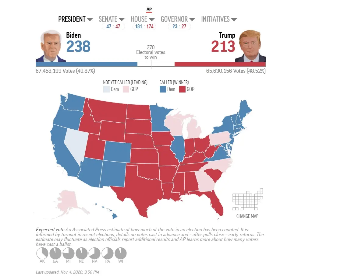 ทั้งนี้ ผลการนับคะแนนเลือกตั้งประธานาธิบดีสหรัฐนายไบเดนยังคงมีคะแนนคณะผู้เลือกตั้งนำอยู่ 238 ขณะที่ประธานาธิบดีทรัมป์ไล่ตีตื้นขึ้นมาที่ 213 โดยการนับคะแนนในพื้นที่รัฐสวิงสเตท หรือรัฐที่ไม่ได้เป็นฐานเสียงของพรรคการเมืองใดยังไม่เสร็จสิ้น ซึ่งในเวลานี้มีอยู่ 4 รัฐคือ รัฐจอร์เจีย, เพนซิลวาเนีย, วิสคอนซิน และมิชิแกน โดยการนับคะแนนในรัฐเหล่านี้ยังสูสี