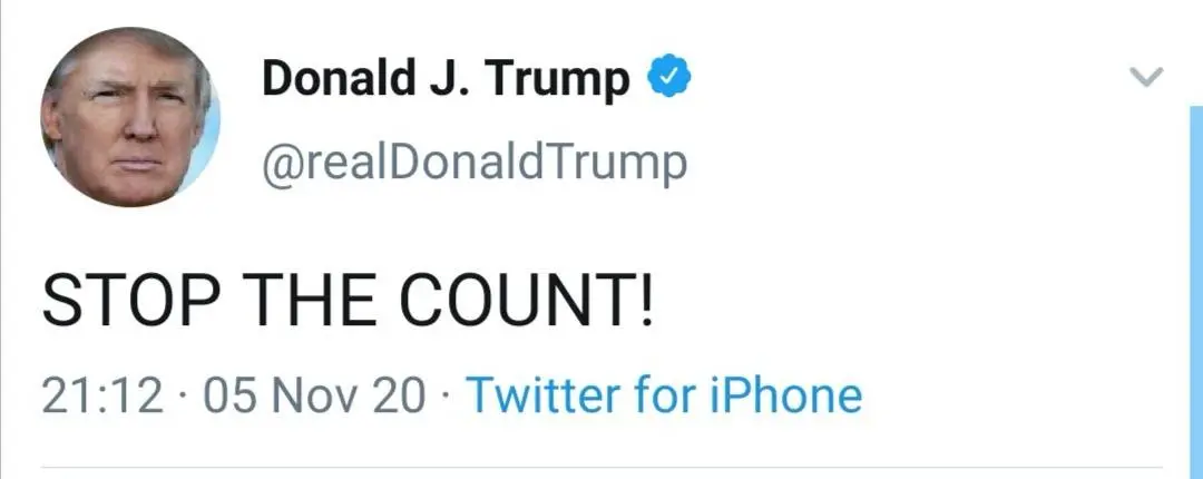 ผลการ เลือกตั้งสหรัฐฯ 2020 เมื่อเวลาประมาณ 21.12 น. ตามเวลาประเทศไทย โดนัลด์ ทรัมป์ ผู้ท้าชิงตำแหน่งประธานาธิบดีสหรัฐอเมริกา จากพรรครีพับลิกัน ได้ทวีตข้อความผ่านทวิตเตอร์ส่วนตัว ว่า STOP THE COUNT! หรือแปลว่า หยุดนับคะแนน!