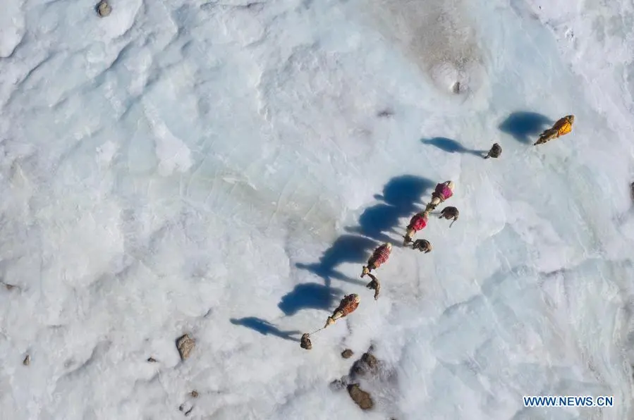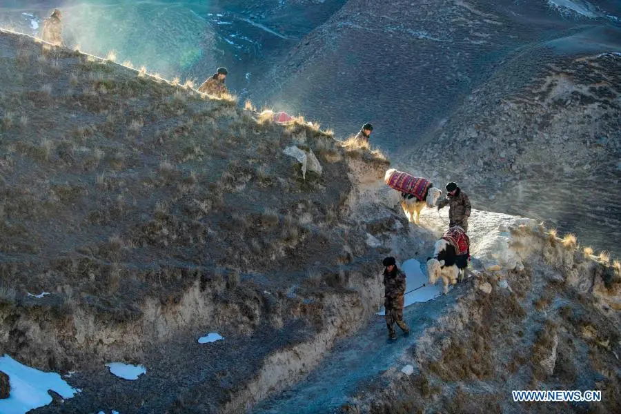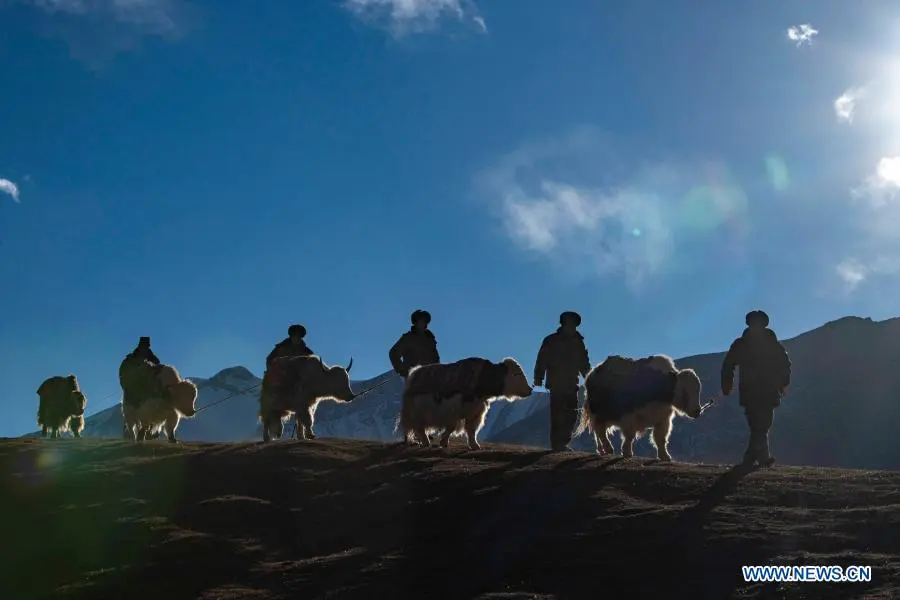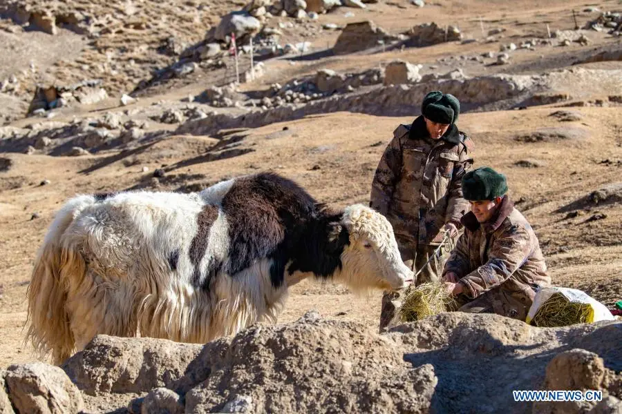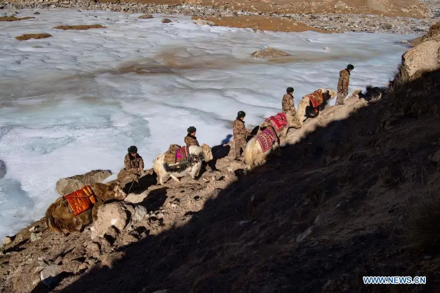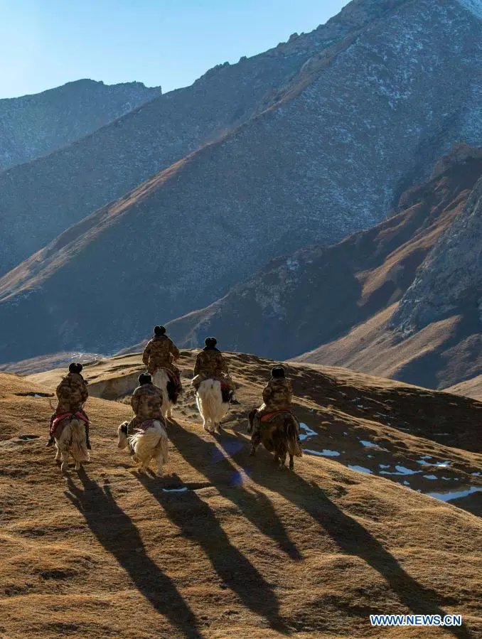 เจ้าหน้าที่หน่วยย่อยของกองพลการผลิตและก่อสร้างซินเจียง (XPCC) แห่งอำเภอเย่เฉิง เมืองถูมู่ซูเค่อ เขตปกครองตนเองซินเจียงอุยกูร์ทางตะวันตกเฉียงเหนือของจีน ซึ่งประจำการอยู่ในพื้นที่หลังเทือกเขาคุนหลุน ที่ระดับความสูงจากน้ำทะเลเฉลี่ยราว 4,000 เมตร ออกลาดตระเวนบริเวณชายแดน โดยคณะเจ้าหน้าที่ที่นี่มักเดินทางสู่ยอดเขาพร้อมเหล่าจามรี