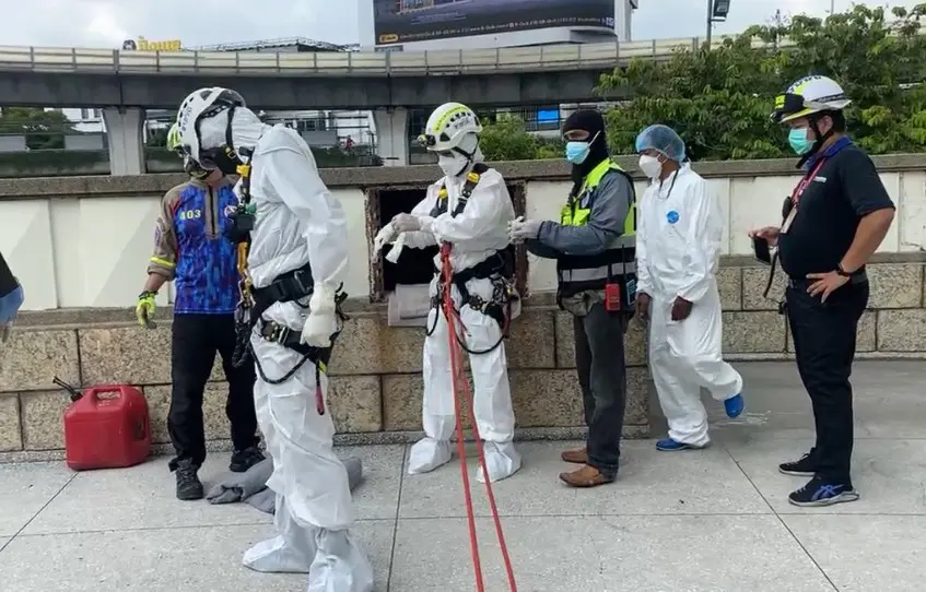 โดยเจ้าหน้าที่ทั้งสองคนจะเล่าให้ทีมกู้ภัยฟังด้วยความขนลุกว่า ได้ยินเสียงคนแก่พูดว่า “ช่วยข้าที ข้ายอมแล้ว เอาข้าขึ้นไปที” จึงรีบเดินหาต้นตอของเสียงดังกล่าวก่อนจะไปส่องดูในปล่องแล้วพบชายคนดังกล่าวตกอยู่ในปล่องของฐานอนุสาวรีย์เมื่อ ในเวลาต่อมาพี่ชายของชายคนดังกล่าวเดินทางมาถึงที่เกิดเหตุ ได้เล่าว่าน้องชาย อายุ 25 ปี มีปัญหาส่วนตัวชอบเก็บตัว ขณะที่เจ้าหน้าที่ซึ่งอยู่ในชุดเซฟตี้ กำลังวางแผนการโรยตัวลงไปช่วยเหลือ เนื่องจากปล่อยค่อนข้างมีความสูงและไม่มีอากาศจึงจำเป็นต้องเร่งให้ความช่วยเหลือ