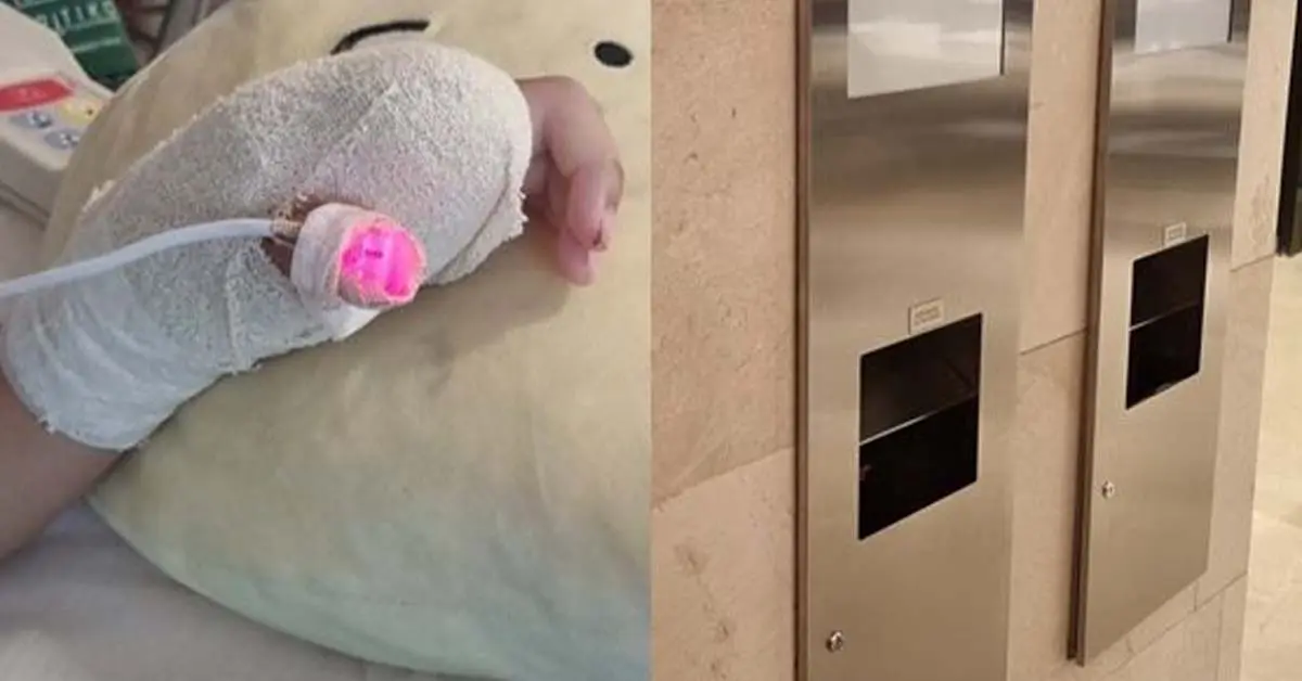 เด็ก 5 ขวบต้องถูกตัดนิ้ว หลังโดนใบพัดของ เครื่องเป่ามือ ในห้องน้ำห้างปั่น เหตุเครื่องชำรุดไม่มีฝาครอบปิด เด็กจึงคิดว่าเป็นตู้กระดาษชำระ