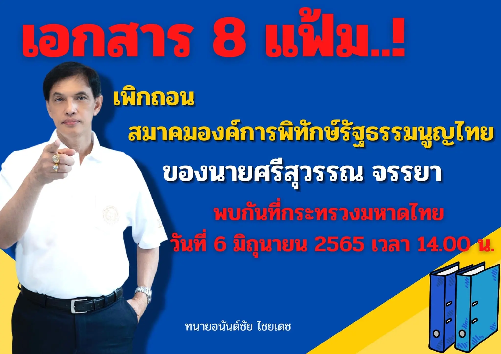 วันนี้ผมมาพบท่าน พล.ต.อ.เสรีพิศุทธ์ เตมียาเวส เพื่อทำและมอบอำนาจให้ผมยื่นหนังสือร้องเรียน ถอนชื่อสมาคมองค์การพิทักษ์รัฐธรรมนูญไทย ออกจากทะเบียนสมาคม ต่ออธิบดีกรมการปกครอง ในฐานะนายทะเบียนกรุงเทพมหานคร ซึ่งมีจำนวน 8 แฟ้ม