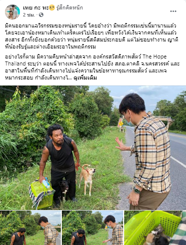 มีคนออกมาแฉวีรกรรมของหนุ่มรายนี้ โดยอ้างว่า มีพฤติกรรมเช่นนี้มานานแล้ว โดยจะเอาน้องหมาเดินเท้าเตร็ดเตร่ไปเรื่อยๆ เพื่อหวังได้เงินจากคนที่เห็นแล้วสงสาร อีกทั้งยังบอกด้วยว่า หนุ่มรายนี้สติสมประกอบดี แต่ไม่ชอบทำงาน ญาติพี่น้องรับรู้และต่างเอือมระอาในพฤติกรรมอย่างไรก็ตาม มีความคืบหน้าล่าสุดจาก องค์กรสวัสดิภาพสัตว์