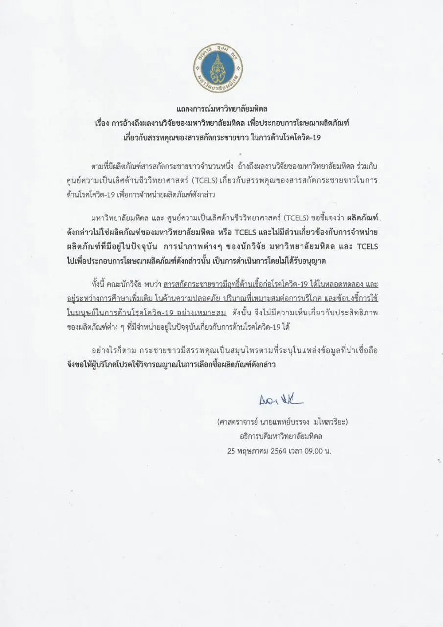 ตามที่มีผลิตภัณฑ์สารสกัดกระชายขาวจำนวนหนึ่ง อ้างถึงผลงานวิจัยของมหาวิทยาลัยมหิดล ร่วมกับศูนย์ความเป็นเลิศด้านชีววิทยาศาสตร์ (TCELS) เกี่ยวกับสรรพคุณของสารสกัดกระชายขาวในการต้านโรคโควิด เพื่อการจำหน่ายผลิตภัณฑ์มหาวิทยาลัยมหิดล และ TCELS ขอชี้แจงว่า ผลิตภัณฑ์ดังกล่าวไม่ใช่ผลิตภัณฑ์ของมหาวิทยาลัยมหิดล หรือ TCELS และไม่มีส่วนเกี่ยวข้องกับการจำหน่ายผลิตภัณฑ์ที่มีอยู่ในปัจจุบัน การนำภาพต่างๆ ของนักวิจัย มหาวิทยาลัยมหิดล และ TCELS ไปเพื่อประกอบการโฆษณาผลิตภัณฑ์ดังกล่าวนั้น เป็นการดำเนินการโดยไม่ได้รับอนุญาต