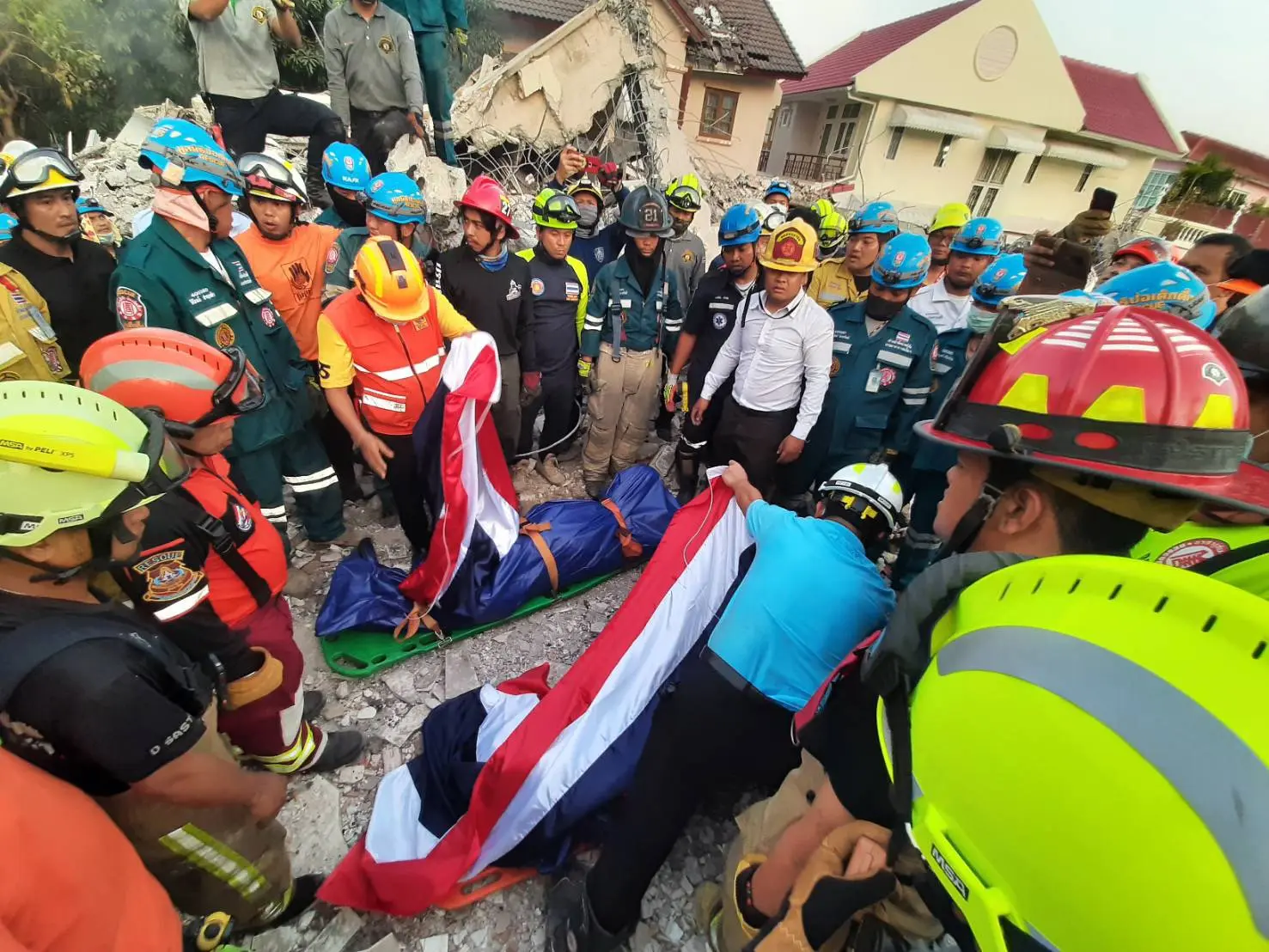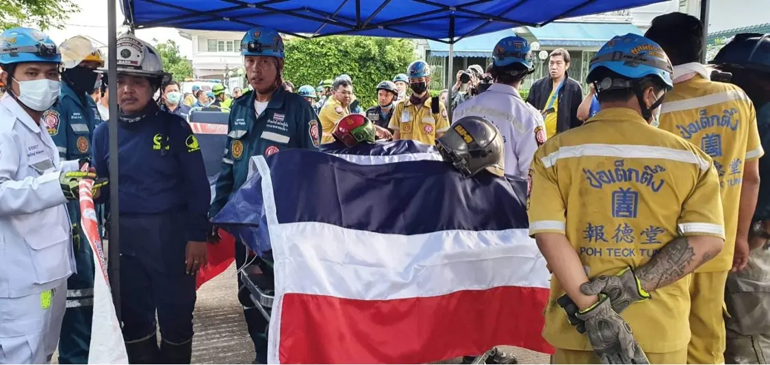 หลังจากนั้นทางผู้ว่าราชการกรุงเทพมหานคร ได้นำธงชาติ มาคลุมร่างผู้เสียชีวิตซึ่งเป็นอาสาสมัครหน่วยงานบรรเทาเยี่ยงวีรบุรุษผู้กล้า อย่างสมเกียรติ
