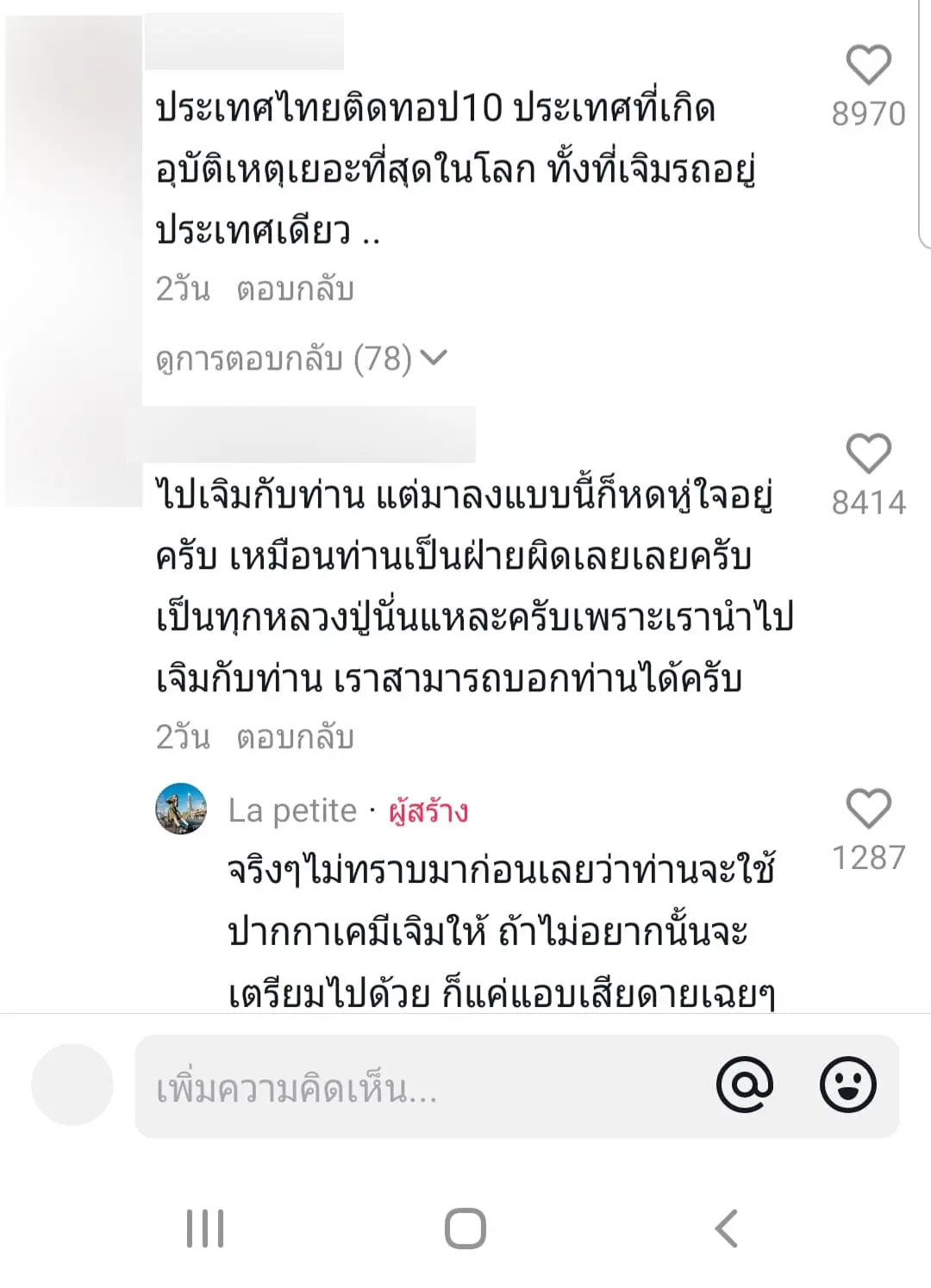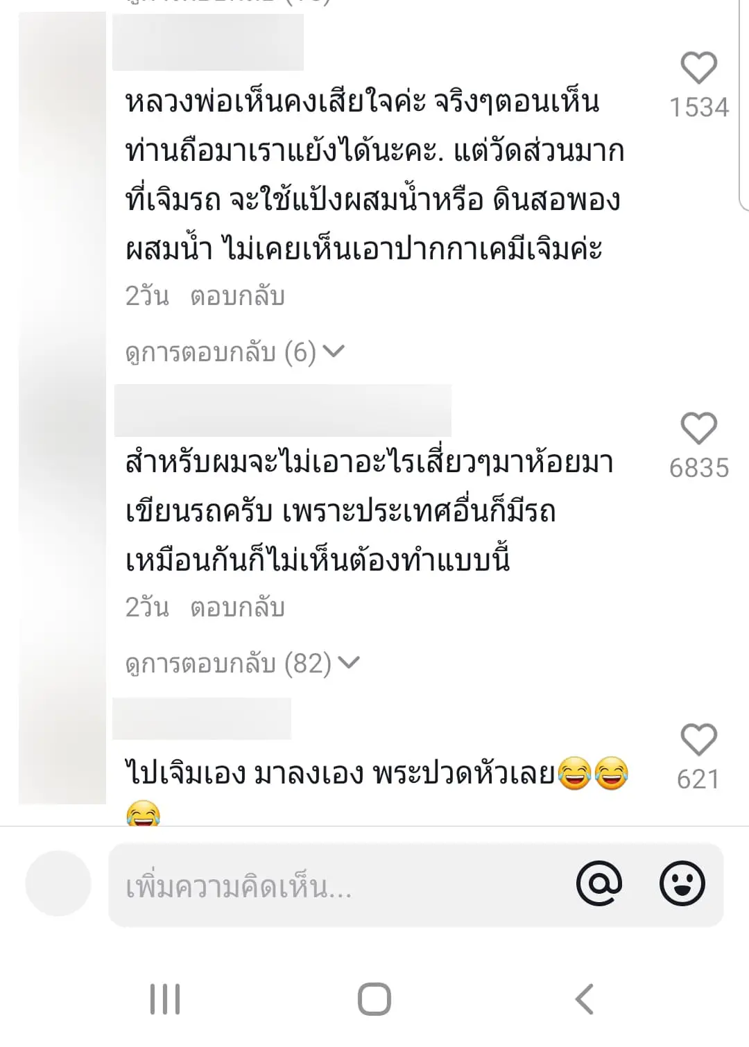 ฝรั่งไม่เห็นเจิมก็ขับกันได้ , ประเทศไทยติดท็อป10 ประเทศที่เกิดอุบัติเหตุเยอะที่สุดในโลก ทั้งที่เจิมรถอยู่ประเทศเดียว อีกส่วนก็ออกมาปกป้องพระ ทำนองว่า หลวงพ่อเห็นคงเสียใจ จริงๆตอนเห็นท่านถือมาเราแย้งได้นะ แต่วัดส่วนมากที่เจิมรถ จะใช้แป้งผสมน้ำหรือ ดินสอพองผสมน้ำ ไม่เคยเห็นเอาปากกาเคมีเจิม , ไปเจิมกับท่าน แต่มาลงแบบนี้ก็หดหู่ใจอยู่ เหมือนท่านเป็นฝ่ายผิดเลยเลย , เป็นทุกหลวงปู่นั่นแหละเพราะเรานำไปเจิมกับท่าน เราสามารถบอกท่านได้ อย่าลงเหมือนท่านผิดเลยไปเจิมกับท่านเเท้ๆน่าจะบอกท่านนะ