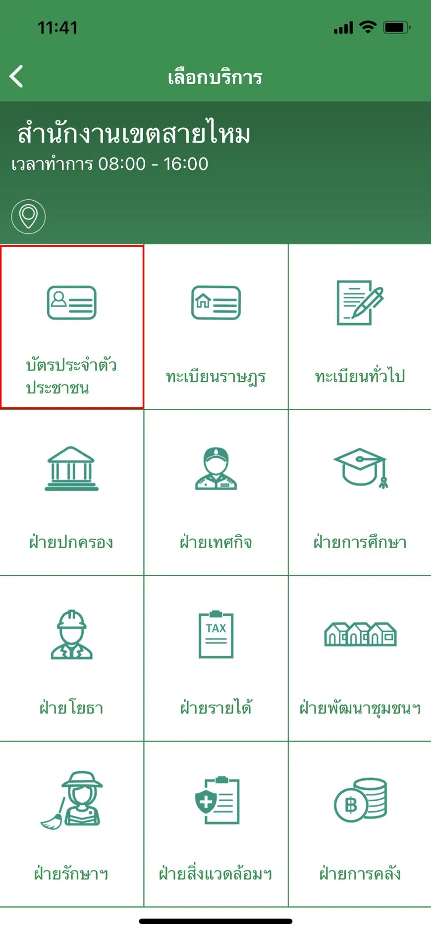 - เมื่อได้เขตที่ต้องการเข้าใช้บริการแล้ว ให้เลือกบริการ ‘บัตรประจำตัวประชาชน‘ (ตามกรอบสีแดง)