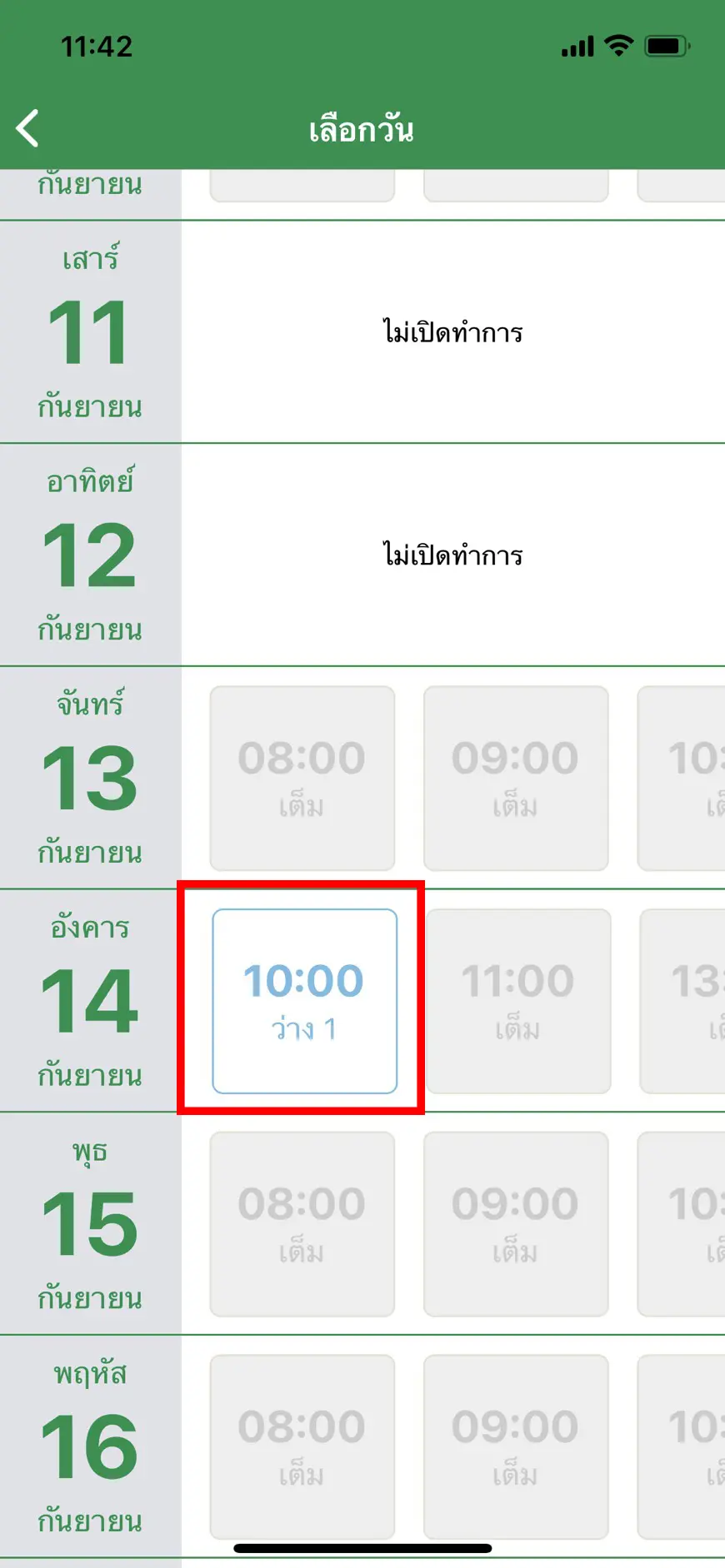 - เลือกวันและเวลาที่ต้องการนัดหมายเข้าใช้บริการ (กรอบสีแดงคือตัวอย่างของวันและเวลาที่ว่าง)