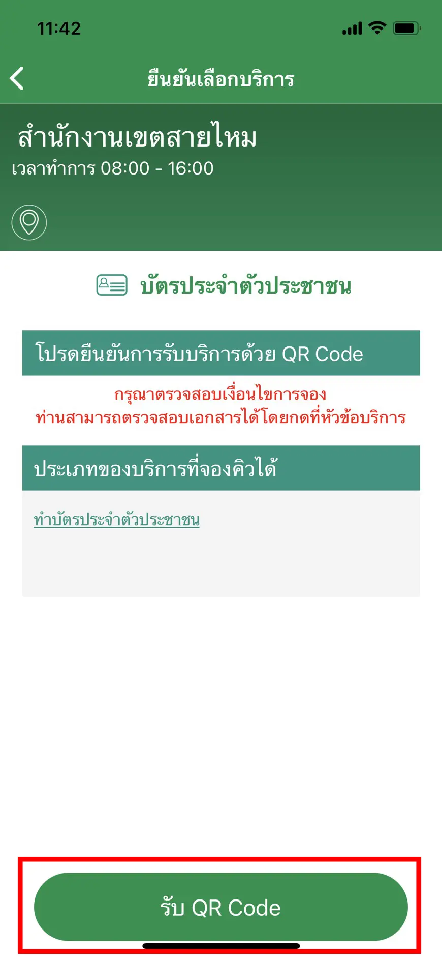 - เมื่อได้วันและเวลาที่จะเข้าใช้บริการ ให้กดรับ QR Code (ตามกรอบสีแดง) เพื่อยืนยันการจองคิวรับบริการ