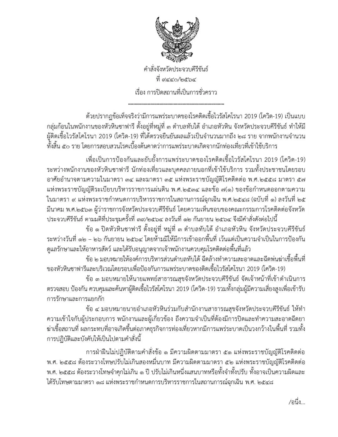 วันนี้ 13 ก.ย.64 นายพัลลภ สิงหเสนี ผู้ว่าราชการจังหวัดประจวบคีรีขันธ์ ประธานคณะกรรมการโรคติดต่อจังหวัดฯ เปิดเผยว่า ได้ลงนามในคำสั่งจังหวัดประจวบคิรีขันธ์ ปิดหัวหินซาฟารี ( Huahinsafari & Adventure Park )ในพื้นที่หมู่ 3 ต.ทับใต้ อ.หัวหิน เป็นการชั่วคราวตั้งแต่บัดนี้ถึงวันที่ 26 กันยายน 2564 หลังพบการแพร่ระบาดของโรคโควิด 19 มีการติดเชื้อในกลุ่มพนักงาน มีผู้ป่วยยืนยันติดเชื้อสะสมแล้ว 28 คน จากพนักงานทั้งหมด 50 คน จากการสอบสวนโรคเบื้องตันจากควาญช้าง คาดว่าการแพร่ระบาดเกิดจากนักท่องเที่ยวที่เข้าไปใช้บริการ ประมาณ 2 สัปดาห์ก่อน โดยได้รับนักท่องเที่ยวนั่งหลังช้าง กระทั่งมีอาการป่วย จึงมาตรวจหาเชื้อโควิดพร้อมภรรยาที่เป็นแม่บ้านอยู่บ้าน เมื่อวันที่ 9 กันยายน ต่อมาผลตรวจพบเชื้อ