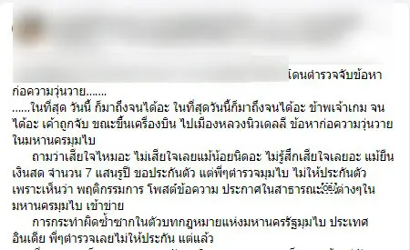 พฤติกรรมการโพสต์ข้อความ ประกาศในสาธารณะต่างๆในมหานครมุมไบ เข้าข่ายการกระทำผิดซ้ำซากในตัวบทกฎหมายแห่งมหานครรัฐมุมไบ ประเทศอินเดีย โดยจะต้องเข้าไปอยู่ในเรือนจำอาจจะประมาณ 3 เดือนกว่าแล้วถึงจะได้กลับไทย