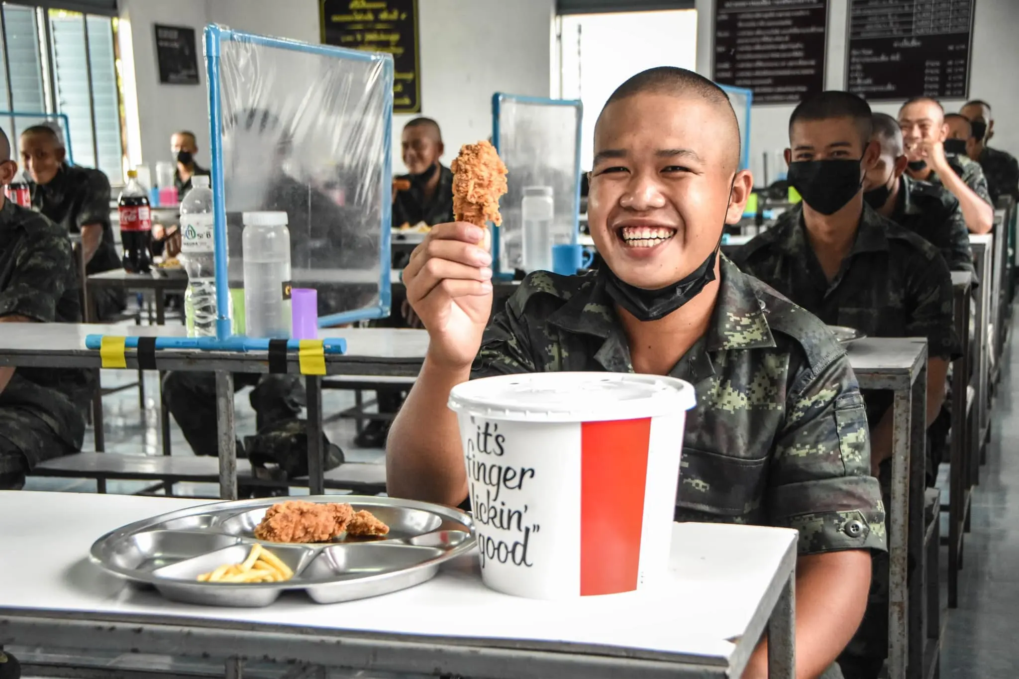 กองทัพบกจัดเลี้ยงทหารใหม่ด้วยไก่ทอดสุดพิเศษ KFC ชุดใหญ่! พื่อสร้างขวัญและกำลังใจ มั่นใจได้ทหารไทยกินดีอยู่่ดี พร้อมทำหน้าที่รั้วของชาติ