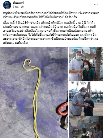 หนูน้อยน้ำใจงามเก็บสร้อยคอทองคำได้ ส่งมอบให้คุณป้าช่วยแจ้งตำรวจตามหาเจ้าของ ด้านเจ้าของนอนร้องไห้ทั้งคืนไม่คิดว่าจะได้สร้อยคืนเมื่อวานนี้ 4 มิ.ย.2564 ช่วงเย็น เด็กหญิงทิพย์ธิดา กรมสิทธิ์ อายุ 9 ปี ได้เดินเล่นบริเวณชายหาดบางแสน แล้วพบเงิน 30 บาท พอก้มหยิบเงินขึ้นมา พบมีสายอะไรบางอย่างสีเหลืองในทรายพอดึงขึ้นมาพบว่าเป็นสร้อยคอทองคำพร้อมพระเลี่ยมทอง จึงได้เก็บขึ้นมาแล้วขี่จักรยานกลับไปบอก นางลัดดา อิ่มสะอาด อายุ 60 ปี ผู้ประกอบการอาหาร ซึ่งเป็นคุณป้าของน้องทิพย์ธิดา ว่าเจอสร้อยตกอยู่ จึงได้เก็บมาให้ช่วยตามหาเจ้าของหน่อยค่ะ