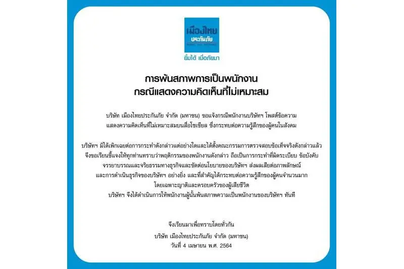 บริษัทฯ จึงได้ดำเนินการให้พนักงานผู้นั้นพ้นสภาพความเป็นพนักงานของบริษัทฯ ทันที จึงเรียนมาเพื่อทราบโดยทั่วกัน บริษัท เมืองไทยประกันภัย จำกัด (มหาชน) วันที่ 4 เมษายน พ.ศ. 2564