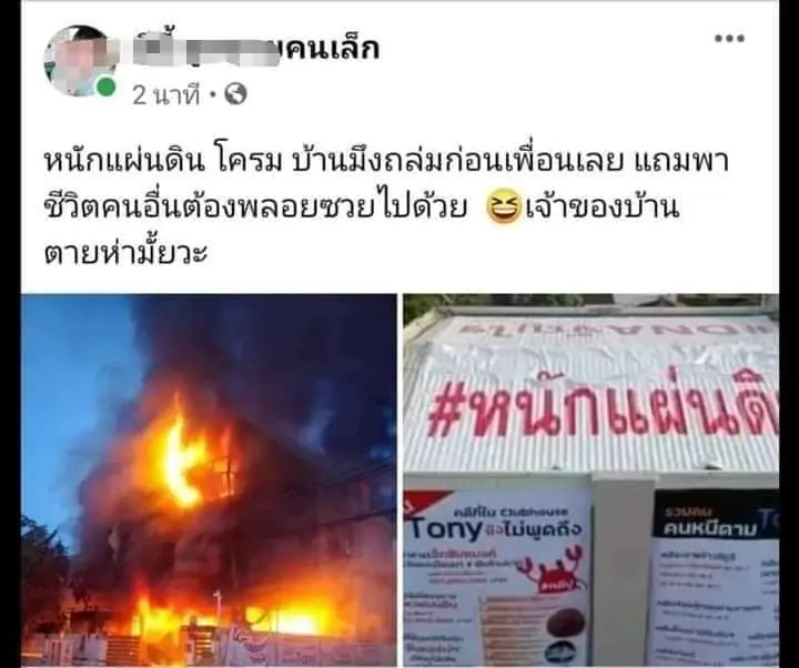ภายหลังผู้ใช้โซเชี่ยลจำนวนหนึ่งที่เห็นต่างทางการเมืองได้เข้าไปแสดงความคิดเห็นและคอมเม้นต์ ต่อว่าโดยความคิดเห็นส่วนมากนั้นนั้นสื่อถึงอาการสะใจในความสูญเสียทรัพย์ของผู้อื่น และเหยียบย่ำความรู้สึกของญาติผู้เสียชีวิต เป็นอย่างยิ่ง โดยผู้ฝช้เฟซบุีคคนดังกล่าวได้มีการคอมเม้นต์ในทำนองที่ว่า อยากให้ผู้อาศัยตายทั้งหมด