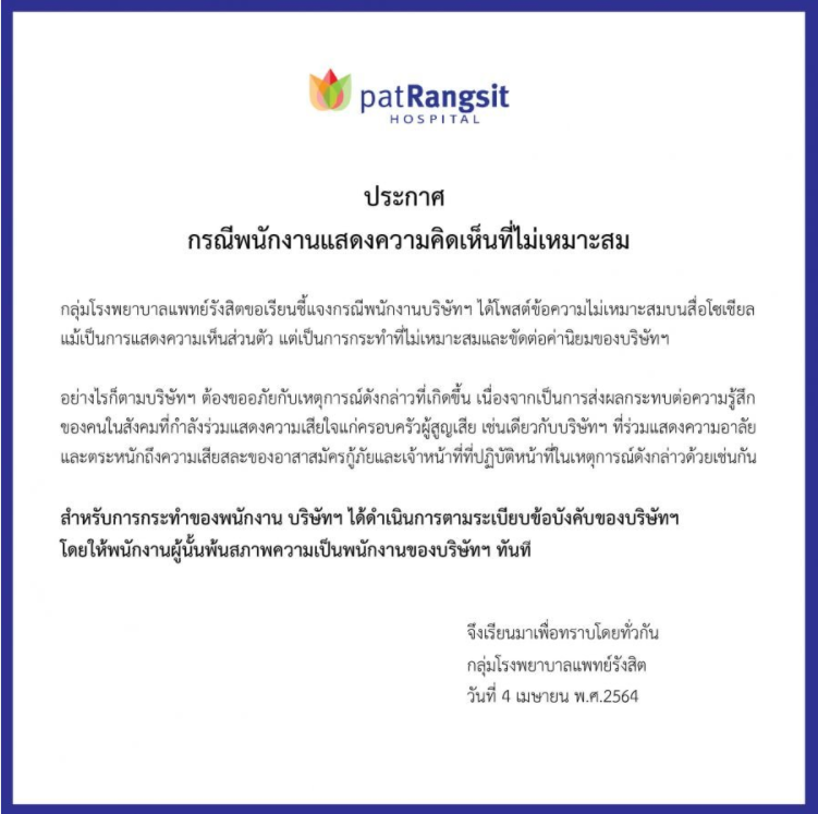 กลุ่มโรงพยาบาลแพทย์รังสิต ขอเรียนชี้แจงกรณีพนักงานบริษัทฯ ได้โพสต์ข้อความไม่เหมาะสมบนสื่อโซเชียล แม้เป็นการแสดงความเห็นส่วนตัว แต่เป็นการกระทำที่ไม่เหมาะสมและขัดต่อค่านิยมของบริษัท