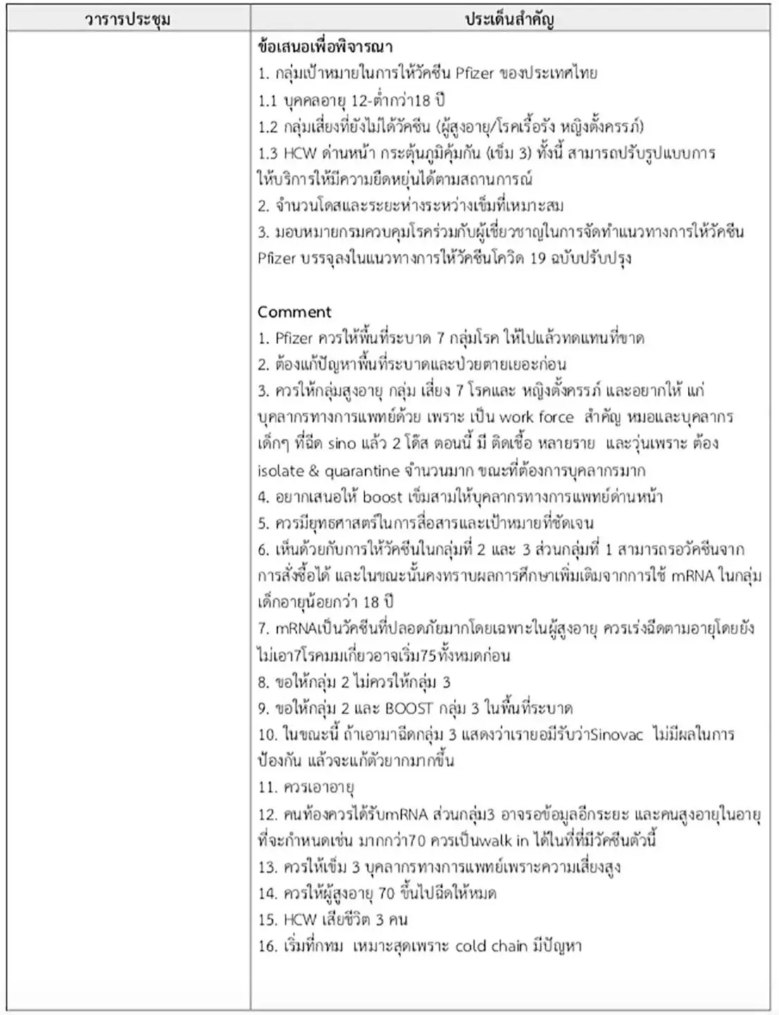โดยเนื้อหาเอกสารดังกล่าวมีวาระการประชุมที่น่าสนใจ เช่น ที่ประชุมประเมินว่าจะได้รับวัคซีนป้องกันโรคระบาดโควิด-19 ยี่ห้อไฟเซอร์ภายในเดือนกรกฎาคม 2564 จำนวน 1.5 ล้านโดส และจะได้รับในไตรมาสที่ 4 รวม 20 ล้านโดสวาระเกี่ยวกับการจัดทำข้อเสนอแนวทางบริหารจัดการวัคซีน มีรายละเอียดว่า ควรมุ่งเน้นไปที่บุคคลทั้ง 3 กลุ่ม ได้แก่