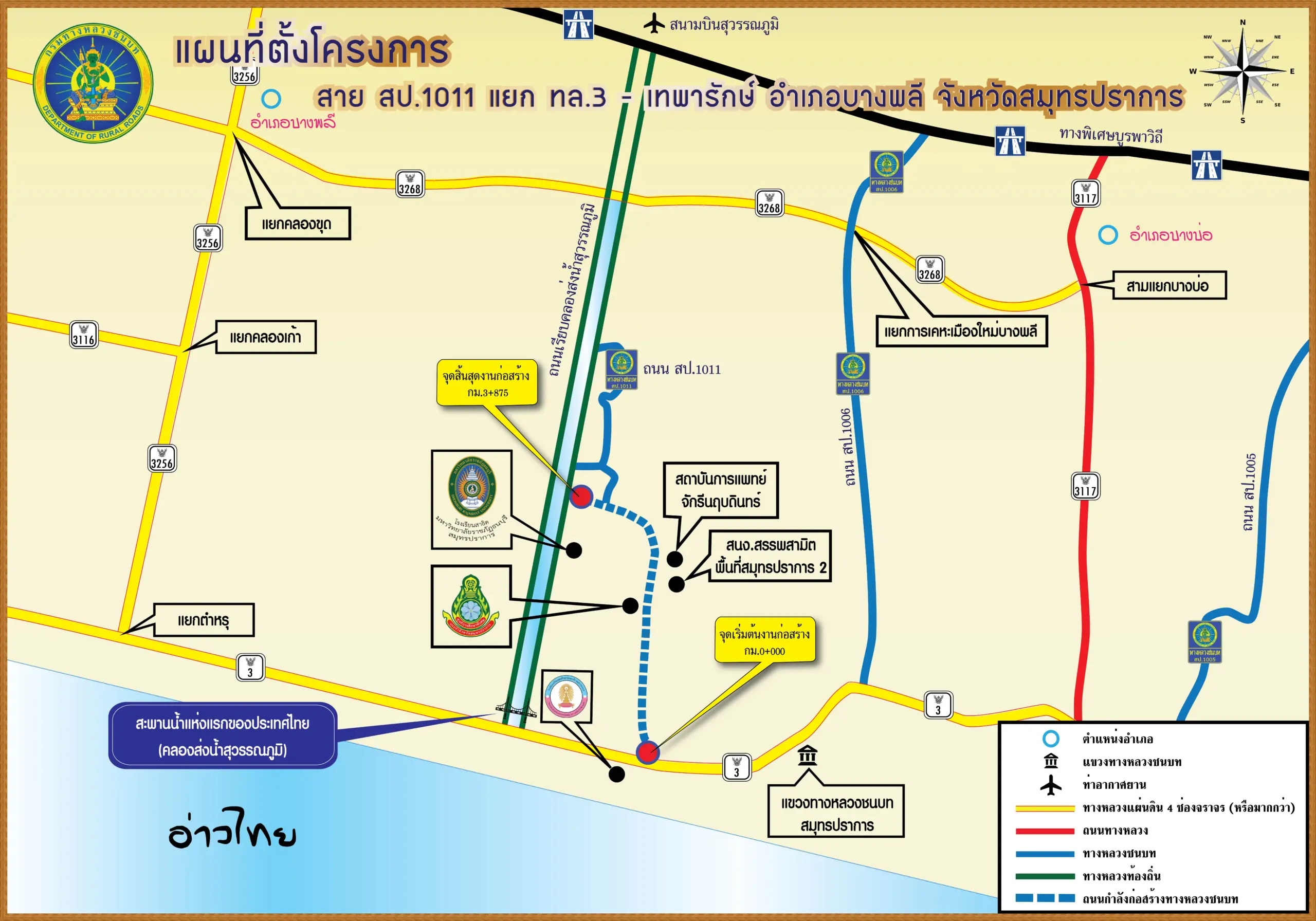 นายปฐม เฉลยวาเรศ อธิบดีกรมทางหลวงชนบท เปิดเผยว่า เพื่อให้สอดรับกับนโยบายของรัฐมนตรีว่าการกระทรวงคมนาคม ในเรื่องการแก้ไขปัญหาจราจรที่หนาแน่น รองรับการขยายตัวของพื้นที่ในอนาคต และสนับสนุนโครงการระเบียงเศรษฐกิจภาคตะวันออก (Eastern Economic Corridor : EEC) กรมทางหลวงชนบทได้ดำเนินการขยายถนนทางหลวงชนบทสาย สป.1011 แยกทางหลวงหมายเลข 3 – เทพารักษ์ อำเภอบางพลี จังหวัดสมุทรปราการ จากเดิม 2 ช่องจราจร เป็น 4 ช่องจราจร โดยก่อสร้างเป็นผิวจราจรแบบคอนกรีตเสริมเหล็ก จาก กม.ที่ 0+000 ถึง กม.ที่ 2+200 และ กม.ที่ 2+900 ถึง กม.ที่ 3+875 ระยะทาง 3.175 กิโลเมตร และช่วงบริเวณหน้าโรงพยาบาลจักรีนฤบดินทร์ ก่อสร้างเป็น 6 ช่องจราจร จาก กม.ที่ 2+200 ถึง กม.ที่ 2+900 ระยะทาง 0.700 กิโลเมตร รวมระยะทางทั้งสิ้น 3.875 กิโลเมตร พร้อมก่อสร้างสะพานคอนกรีตเสริมเหล็ก 5 แห่ง และระบบระบายน้ำ ไฟฟ้าแสงสว่าง เครื่องหมายจราจร สิ่งอำนวยความปลอดภัย