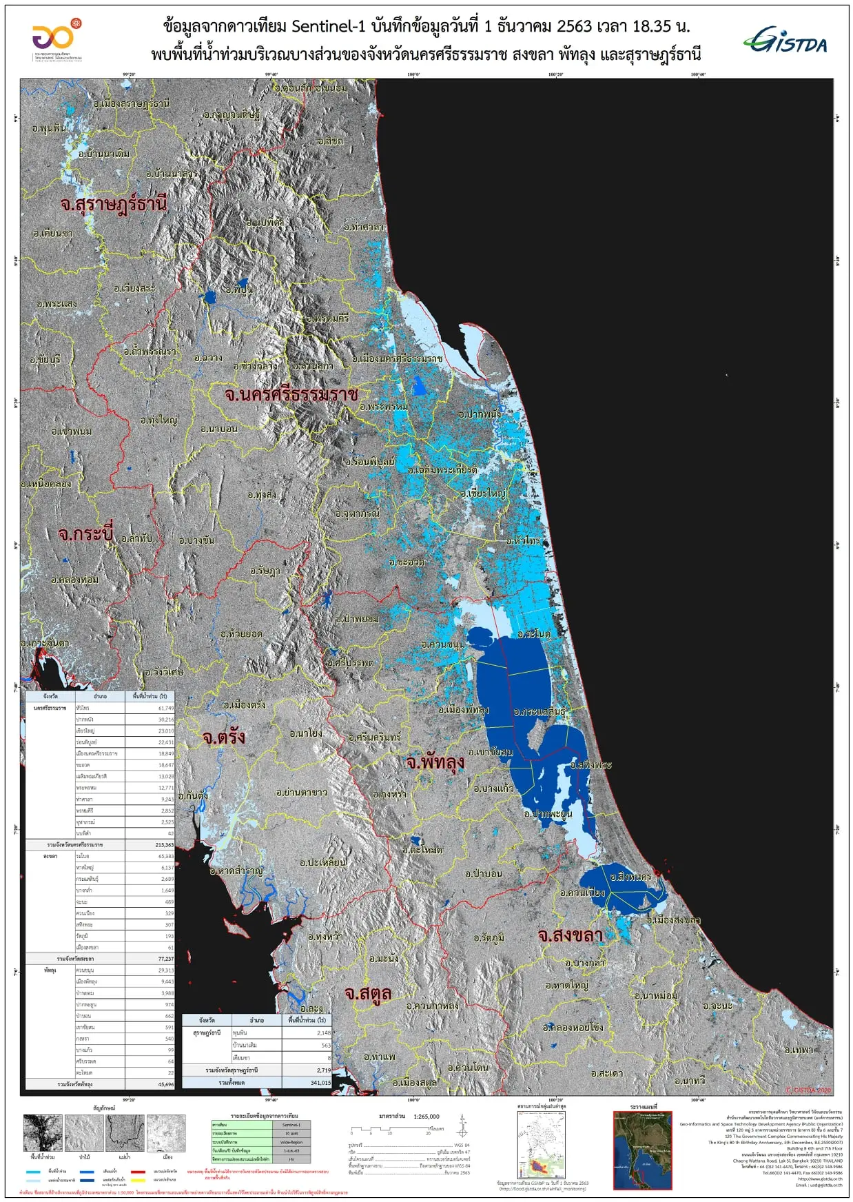 ขณะที่ สำนักงานพัฒนาเทคโนโลยีอวกาศและภูมิสารสนเทศ (องค์การมหาชน) หรือ GISTDA เปิดเผยข้อมูลจากดาวเทียม sentinel-1 เมื่อวันที่ 1 ธันวาคม 2563 พบน้ำท่วมขังในพื้นที่ จ.นครศรีธรรมราช สุราษฏร์ธานี สงขลา และพัทลุง กว่า 340,000 ไร่ โดยพื้นที่ของนครศรีธรรมราช หนักสุดกว่า 215,000 ไร่