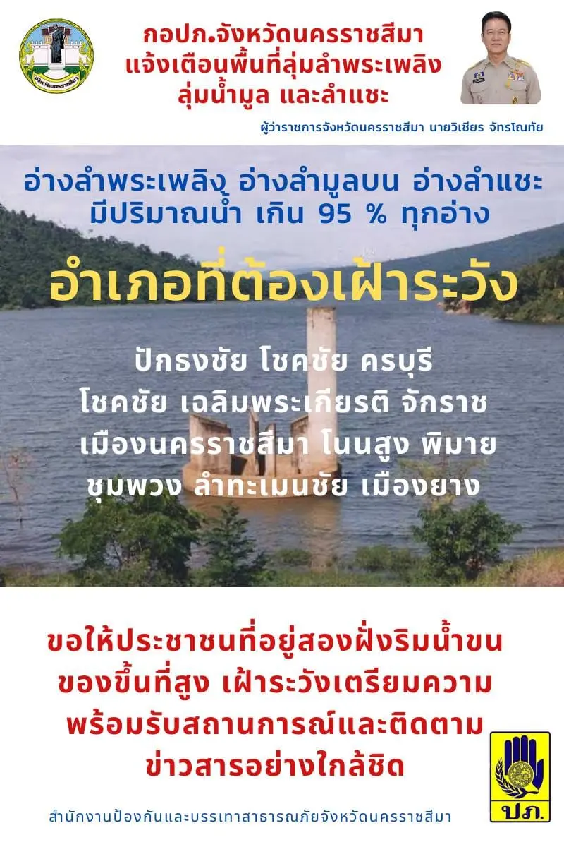 ผู้ว่าราชการ จ.นครราชสีมา ออกประกาศเตือน เฝ้าระวังระดับน้ำ 3 อ่าง ลำพระเพลิง-ลำมูลบน-ลำแซะ หลังปริมาณน้ำเกิน 95 %