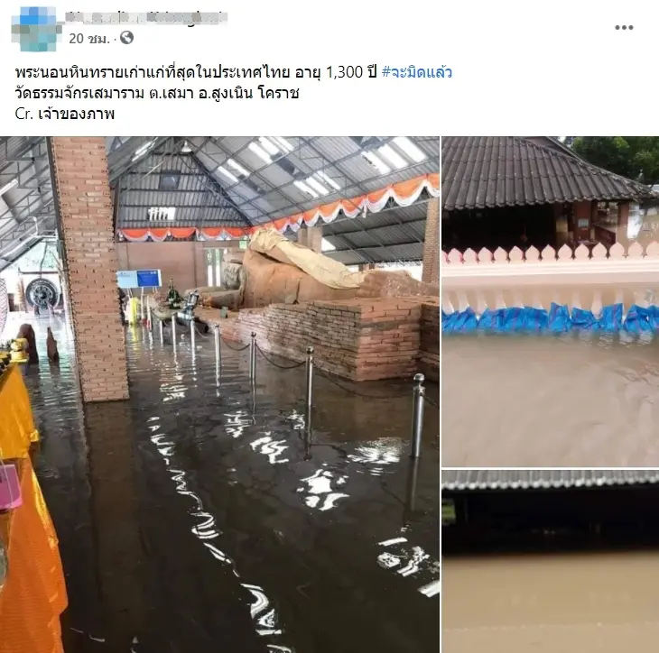 ชาวเน็ตแชร์ภาพ พระนอน วัดธรรมจักรเสมาราม อ.สูงเนิน อายุกว่า1,300ปีใกล้จมน้ำ หลังน้ำท่วมโคราชหวั่นสมบัติชาติเสียหาย