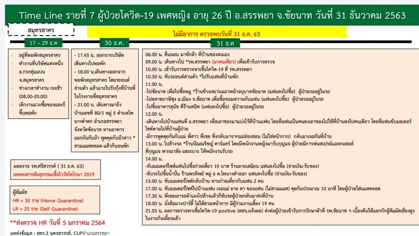 โดยเดินทางมาจากจังหวัดสมุทรสาคร เมื่อวันที่ 30 ธันวาคม 2563 เวลา 18.00 น.ถึงจังหวัดชัยนาทเวลา 21.00 น. ในวันที่ 31 ธันวาคม 2563 เวลา 9.00 – 10.00 น. ได้เดินทางไปตรวจหาเชื้อ COVID-19 ที่โรงพยาบาลสรรพยา หลังจากนั้น เวลา 10.30 น. เดินทางไปรับเพื่อนหญิงที่ ตำบลสรรพยา อำเภอสรรพยา เวลา 11.00 น. เดินทางไปซื้อเนื้อหมูที่ร้านจำหน่ายเนื้อหมูที่หน้าอนุบาลชัยนาท และเดินทางไปตลาดภาษีซุง และซื้ออาหารสุนัข ที่ร้านจำหน่ายอาหารสัตว์ บริเวณซอยร้านแสงอาทิตย์