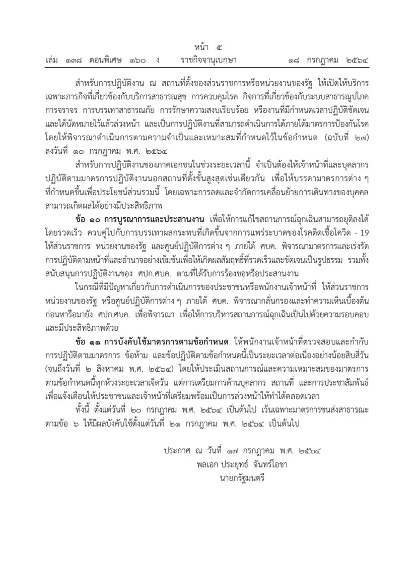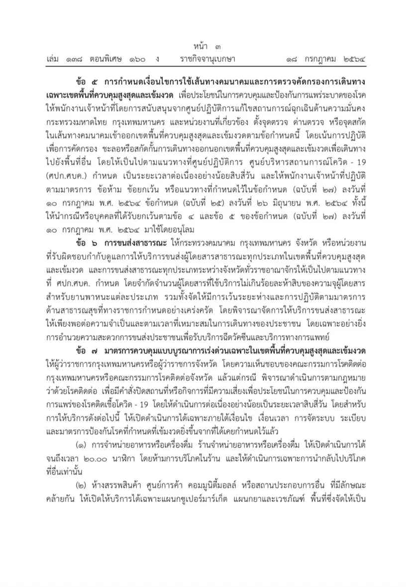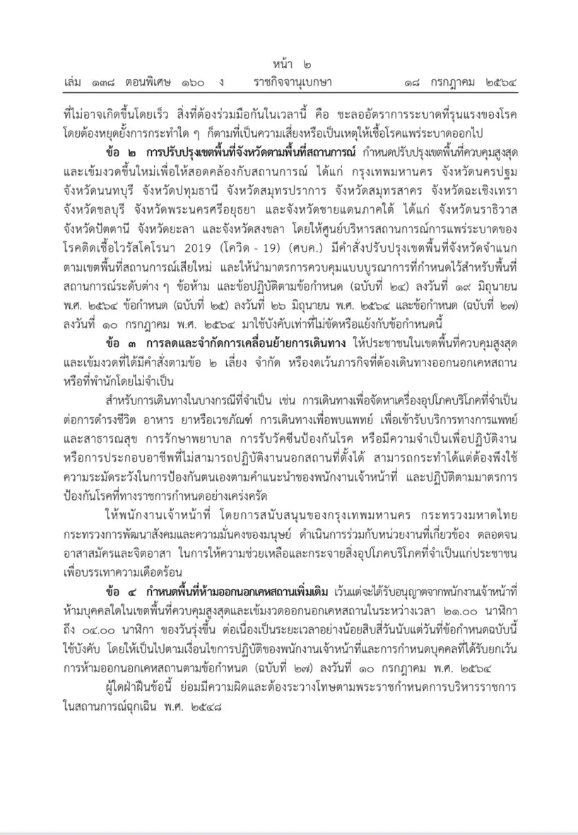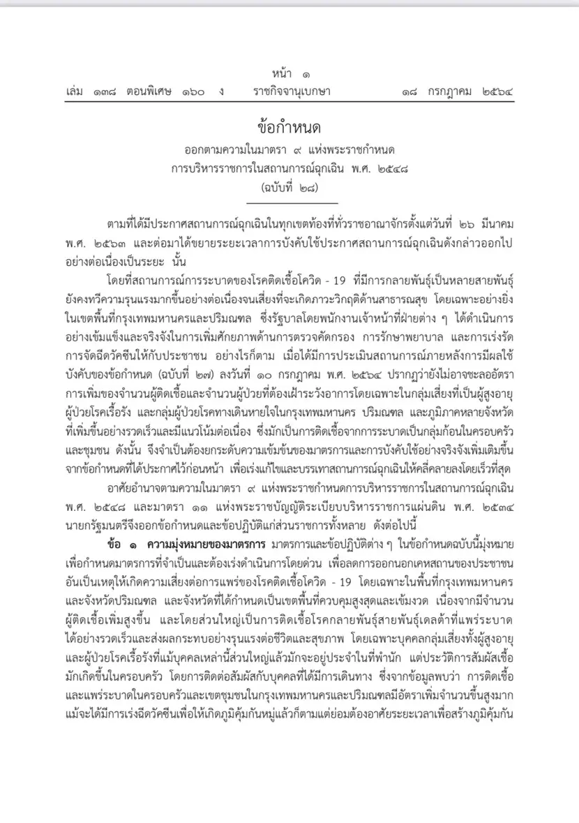 วันที่ 18 กรกฎาคม 2564 เว็บไซต์ราชกิจจานุเบกษา เผยแพร่ ข้อกำหนดออกตามความในมาตรา 9 แห่งพระราชกำหนด การบริหารราชการในสถานการณ์ฉุกเฉิน พ.ศ. 2548 (ฉบับที่ 28)