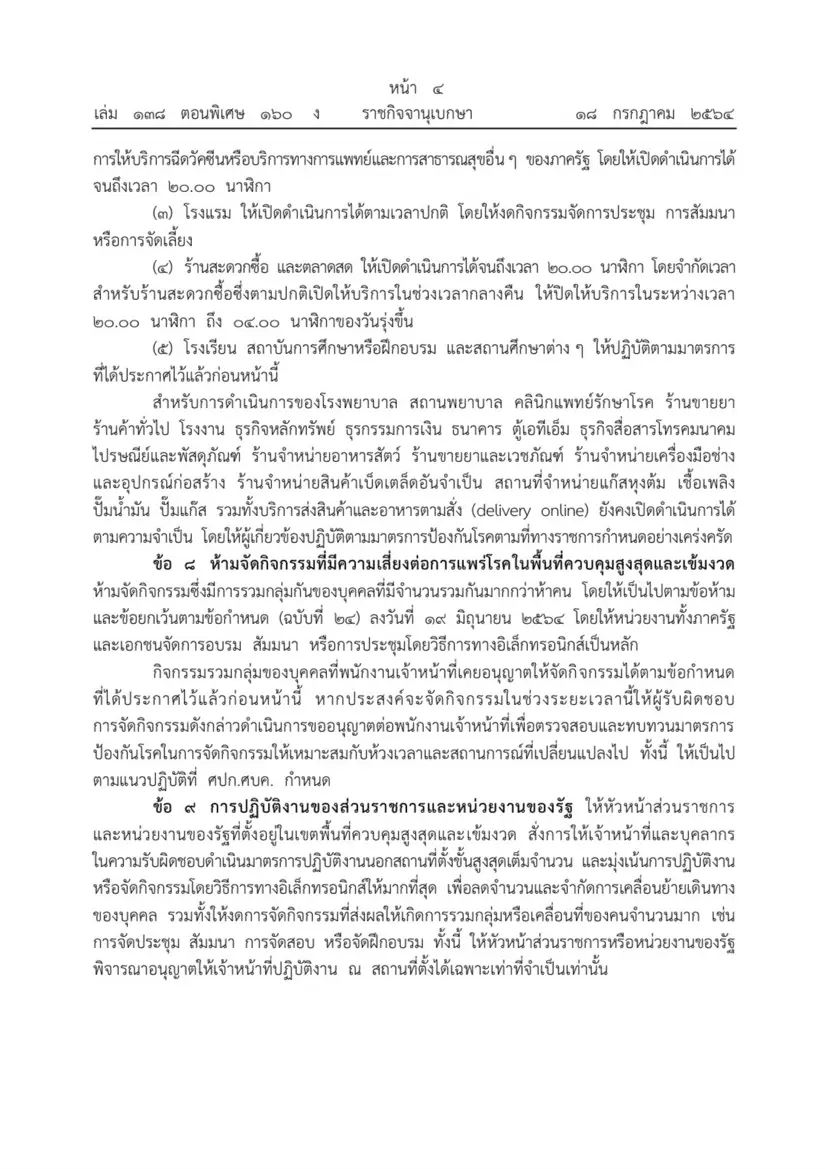 - 4.ร้านสะดวกซื้อ ตลาดสด เปิดได้จนถึงเวลา 20.00 น. โดยจํากัดเวลาสําหรับร้านสะดวกซื้อซึ่งตามปกติเปิดให้บริการในช่วงเวลากลางคืน ให้ปิดให้ระหว่างเวลา 20.00 น. ถึง 04.00 น. ของวันรุ่งขึ้น